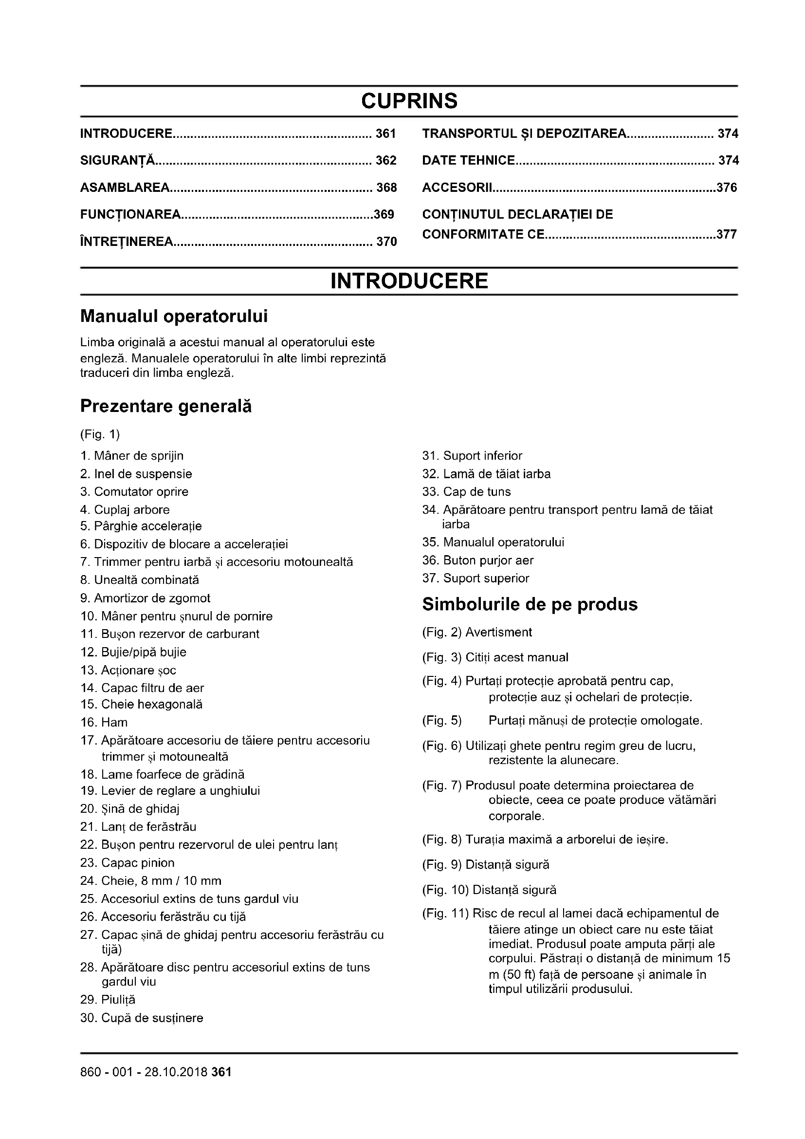 CONFORMITATE CE.................................................377 INTRODUCERE Manualul operatorului Limba originală a acestui manual al operatorului este engleză. Manualele operatorului în alte limbi reprezintă traduceri din limba engleză. Prezentare generală (Fig. 1)
