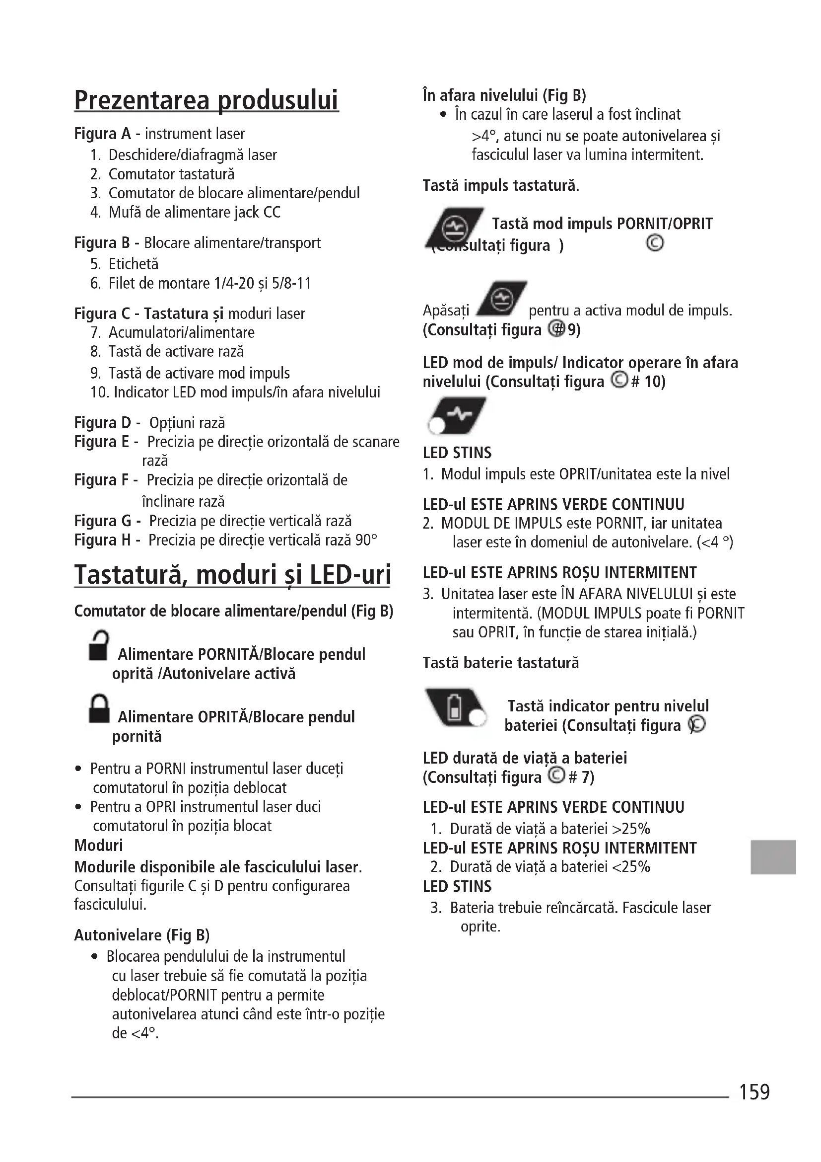 Figura D - Opţiuni rază Figura E - Precizia pe direcţie orizontală de scanare rază Figura F - Precizia pe direcţie orizontală de înclinare rază Figura G - Precizia pe direcţie verticală rază Figura H - Precizia pe direcţie verticală rază 90° Tastatură, moduri şi LED-uri Comutator de blocare alimentare/pendul (Fig B) Alimentare PORNITĂ/Blocare pendul oprită /Autonivelare activă Alimentare OPRITĂ/Blocare pendul pornită