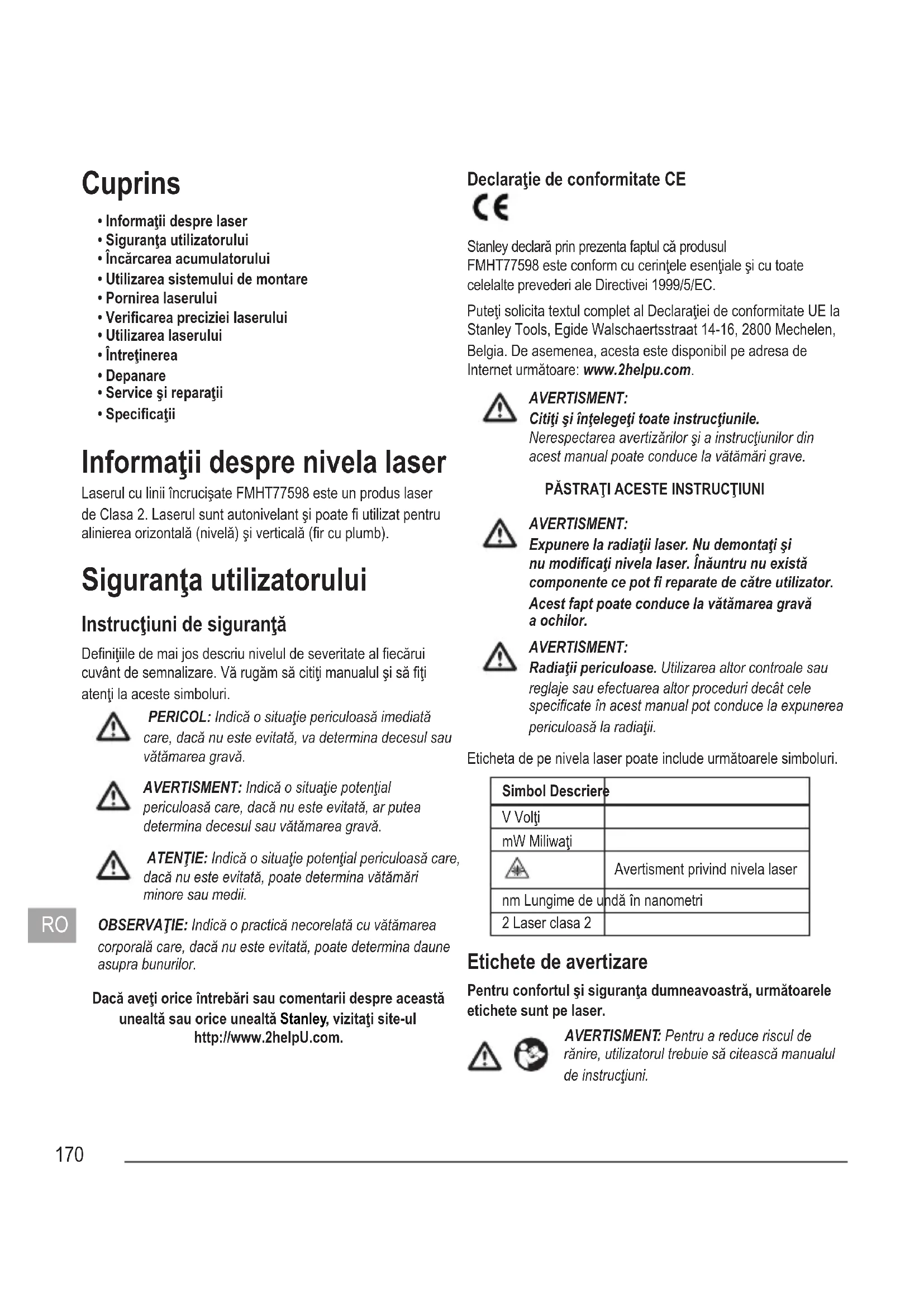 - Specicaţii Informaţii despre nivela laser Laserul cu linii încrucişate FMHT77598 este un produs laser de Clasa 2. Laserul sunt autonivelant şi poate utilizat pentru alinierea orizontală (nivelă) şi verticală (r cu plumb). Siguranţa utilizatorului Instrucţiuni de siguranţă Deniţiile de mai jos descriu nivelul de severitate al ecărui cuvânt de semnalizare. Vă rugăm să citiţi manualul şi să ţi atenţi la aceste simboluri. PERICOL: Indică o situaţie periculoasă imediată care, dacă nu este evitată, va determina decesul sau vătămarea gravă. AVERTISMENT: Indică o situaţie potenţial periculoasă care, dacă nu este evitată, ar putea determina decesul sau vătămarea gravă. ATENŢIE: Indică o situaţie potenţial periculoasă care, dacă nu este evitată, poate determina vătămări minore sau medii. OBSERVAŢIE: Indică o practică necorelată cu vătămarea corporală care, dacă nu este evitată, poate determina daune asupra bunurilor. Dacă aveţi orice întrebări sau comentarii despre această unealtă sau orice unealtă Stanley, vizitaţi site-ul http://www.2helpU.com. Declaraţie de conformitate CE Stanley declară prin prezenta faptul că produsul FMHT77598 este conform cu cerinţele esenţiale şi cu toate celelalte prevederi ale Directivei 1999/5/EC. Puteţi solicita textul complet al Declaraţiei de conformitate UE la Stanley Tools, Egide Walschaertsstraat 14-16, 2800 Mechelen, Belgia. De asemenea, acesta este disponibil pe adresa de Internet următoare: www.2helpu.com. AVERTISMENT: Citiţi şi înţelegeţi toate instrucţiunile. Nerespectarea avertizărilor şi a instrucţiunilor din acest manual poate conduce la vătămări grave.