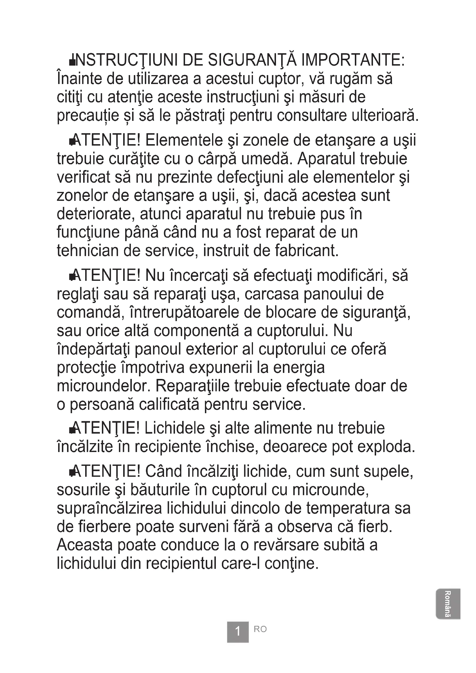 INSTRUCŢIUNI DE SIGURANŢĂ IMPORTANTE: Înainte de utilizarea a acestui cuptor, vă rugăm să citiţi cu atenţie aceste instrucţiuni şi măsuri de precauție și să le păstraţi pentru consultare ulterioară.