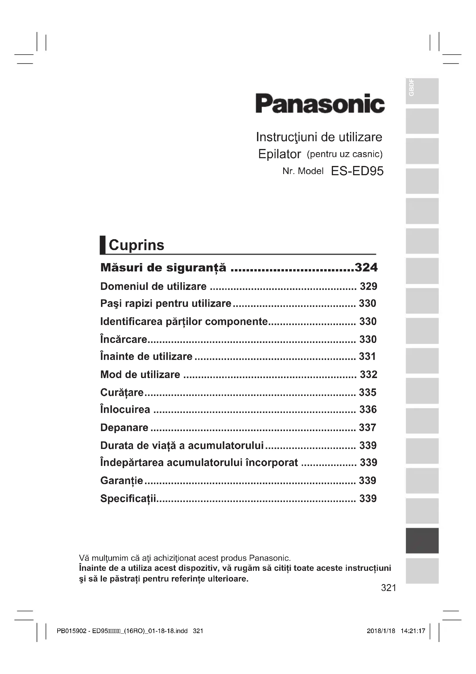 - Aveţi grijă să nu scurtcircuitaţi borna pozitivă şi cea negativă a acumulatorului scos; în acest scop, izolaţi bornele cu bandă. Pentru protecţia mediului şi reciclarea materialelor Acest epilator conţine o baterie Li‑ion. Vă rugăm să vă asiguraţi că bateria este predată într‑un punct ocial desemnat, dacă există unul în ţara dvs. Garanţie Vă rugăm să vizitaţi web site‑ul Panasonic http://www.panasonic.com sau să contactaţi un centru de service autorizat (găsiţi adresa de contact în broşura de garanţie paneuropeană) dacă aveţi nevoie de informaţii sau dacă epilatorul sau cablul este deteriorat. Specicaţii Sursă de alimentare Consultaţi plăcuţa de identicare de pe adaptorul de c.a. (Conversie automată a tensiunii de alimentare) Timp de încărcare Aprox. 1 oră Zgomot acustic în aer Cap de epilat pentru picioare/braţe: 69 (dB (A) re 1 pW) Cap de epilat pentru subraţ/linia bikinilor: 67 (dB (A) re 1 pW) Cap de ras: 61 (dB (A) re 1 pW) Cap de îngrijire a picioarelor: 66 (dB (A) re 1 pW) Cap de periere cu perie sonică de spălare: 65 (dB (A) re 1 pW) Aceste produs este destinat numai utilizării casnice. PB015902 - ED95_(16RO)_01-18-18.indd 339 2018/1/18 14:21:20340 Depunerea la deşeuri a echipamentelor şi a bateriilor vechi Doar pentru Uniunea Europeană şi pentru ţările cu sisteme de reciclare Aceste simboluri de pe produse, ambalaje şi/sau documentele însoţitoare indică faptul că produsele electrice şi electronice, precum şi bateriile uzate nu trebuie să e amestecate cu deşeurile menajere obişnuite. Pentru un tratament corespunzător, pentru recuperarea şi reciclarea produselor vechi şi a bateriilor uzate, vă rugăm să le depuneţi la punctele de colectare special amenajate, în conformitate cu legislaţia naţională. Prin depunerea corespunzătoare a acestora la deşeuri, veţi ajuta la economisirea unor resurse valoroase şi veţi preveni potenţiale efecte negative asupra sănătăţii umane şi asupra mediului înconjurător. Pentru mai multe informaţii despre colectare şi reciclare, vă rugăm să contactaţi autorităţile locale. Este posibil ca depunerea incorectă la deşeuri să e pedepsită în conformitate cu legile naţionale. Notă pentru simbolul de baterie (ultimele două exemple de simboluri) Acest simbol poate utilizat în combinaţie cu un simbol chimic. În acest caz, acesta este conform cu cerinţele stabilite de Directivă pentru elementul chimic în cauză. PB015902 - ED95_(16RO)_01-18-18.indd 340 2018/1/18 14:21:20341 GBDFINLEDKPNSFINPLCZSKHROTR Bu Panasonic ürününü aldığınız için teşekkür ederiz.Bu üniteyi kullanmadan önce lütfen talimatları eksiksiz okuyun ve ileride kullanmak için saklayın. Kullanım Talimatları (Ev İçin) Epilatör Model No. ES‑ED95 İçindekiler Güvenlik önlemleri ..................................344 Kullanım amacı ............................................................ 349 Kullanım için hızlı adımlar .......................................... 349 Parçaların tanımı.......................................................... 350 Şarj Etme ...................................................................... 350 Kullanım öncesinde..................................................... 351 Kullanım ....................................................................... 351 Temizleme .................................................................... 354 Değiştirme ................................................................... 355 Sorun giderme ............................................................. 356 Pil ömrü ........................................................................ 358 Dahili şarj edilebilir pilin çıkarılması.......................... 358 Garanti .......................................................................... 358 Özellikler....................................................................... 358 PB015902 - ED95_(17TR)_01-18-18.indd 341 2018/1/18 14:23:17342 Uyarı