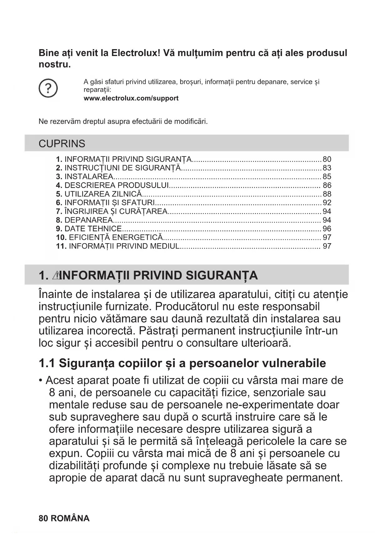 - Acest aparat poate fi utilizat de copiii cu vârsta mai mare de 8 ani, de persoanele cu capacități fizice, senzoriale sau mentale reduse sau de persoanele ne-experimentate doar sub supraveghere sau după o scurtă instruire care să le ofere informațiile necesare despre utilizarea sigură a aparatului și să le permită să înțeleagă pericolele la care se expun. Copiii cu vârsta mai mică de 8 ani și persoanele cu dizabilități profunde și complexe nu trebuie lăsate să se apropie de aparat dacă nu sunt supravegheate permanent. 80 ROMÂNA• Copiii trebuie supravegheați pentru a vă asigura că nu se joacă cu aparatul.
