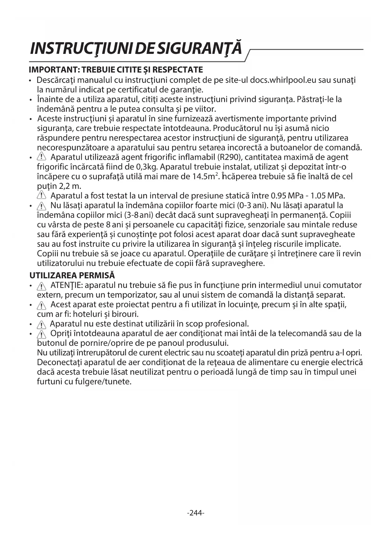 - Temperatura de afară este mai mică de 18°C. Nu încercaţi să folosiţi aparatul de aer condiţionat în modul de răcire atunci când temperatura de afară este sub 18 °C. Notă: Dacă problemele persistă, opriţi aparatul şi deconectaţi-l de la reţeaua de alimentare electrică, apoi contactaţi cel mai apropiat Centru de service autorizat Whirlpool. Nu încercaţi să mutaţi, să reparaţi, să dezasamblaţi sau să modificaţi singur aparatul.-258-