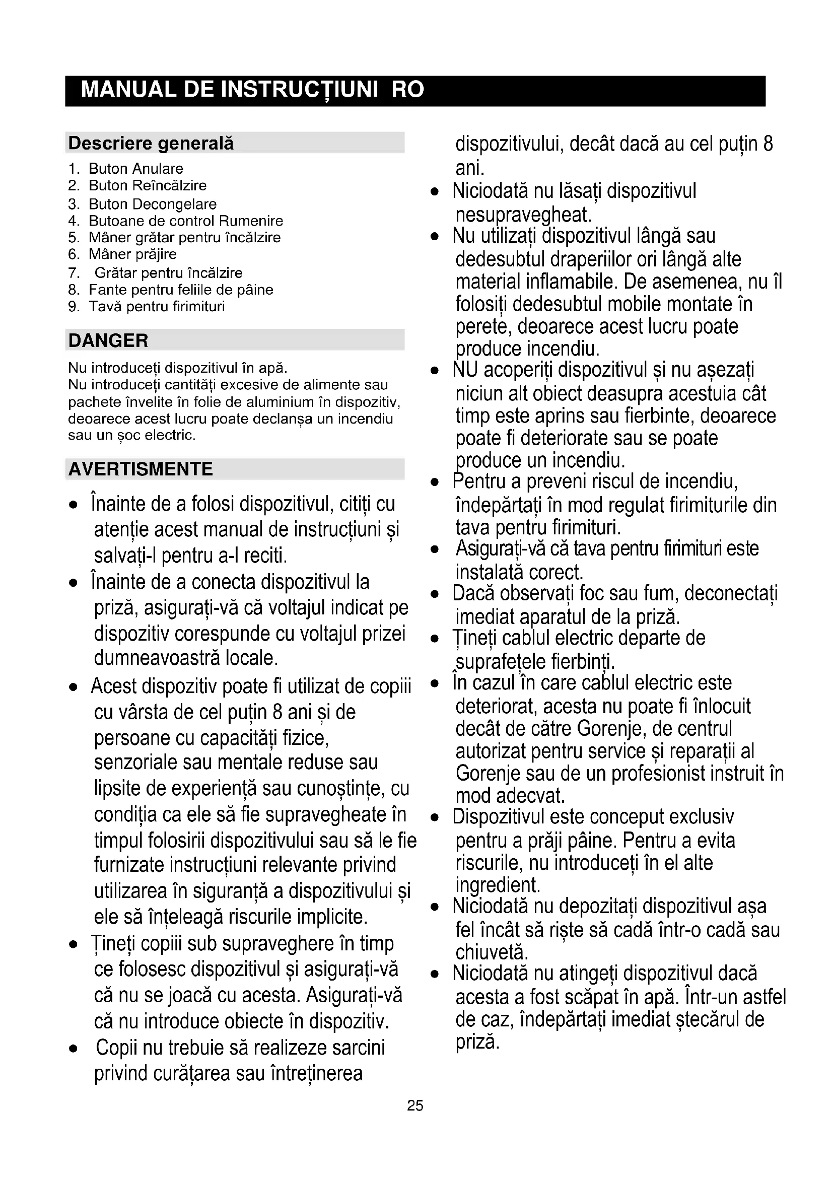 - Dispozitivul este conceput exclusiv pentru a prăji pâine. Pentru a evita riscurile, nu introduceți în el alte ingredient.