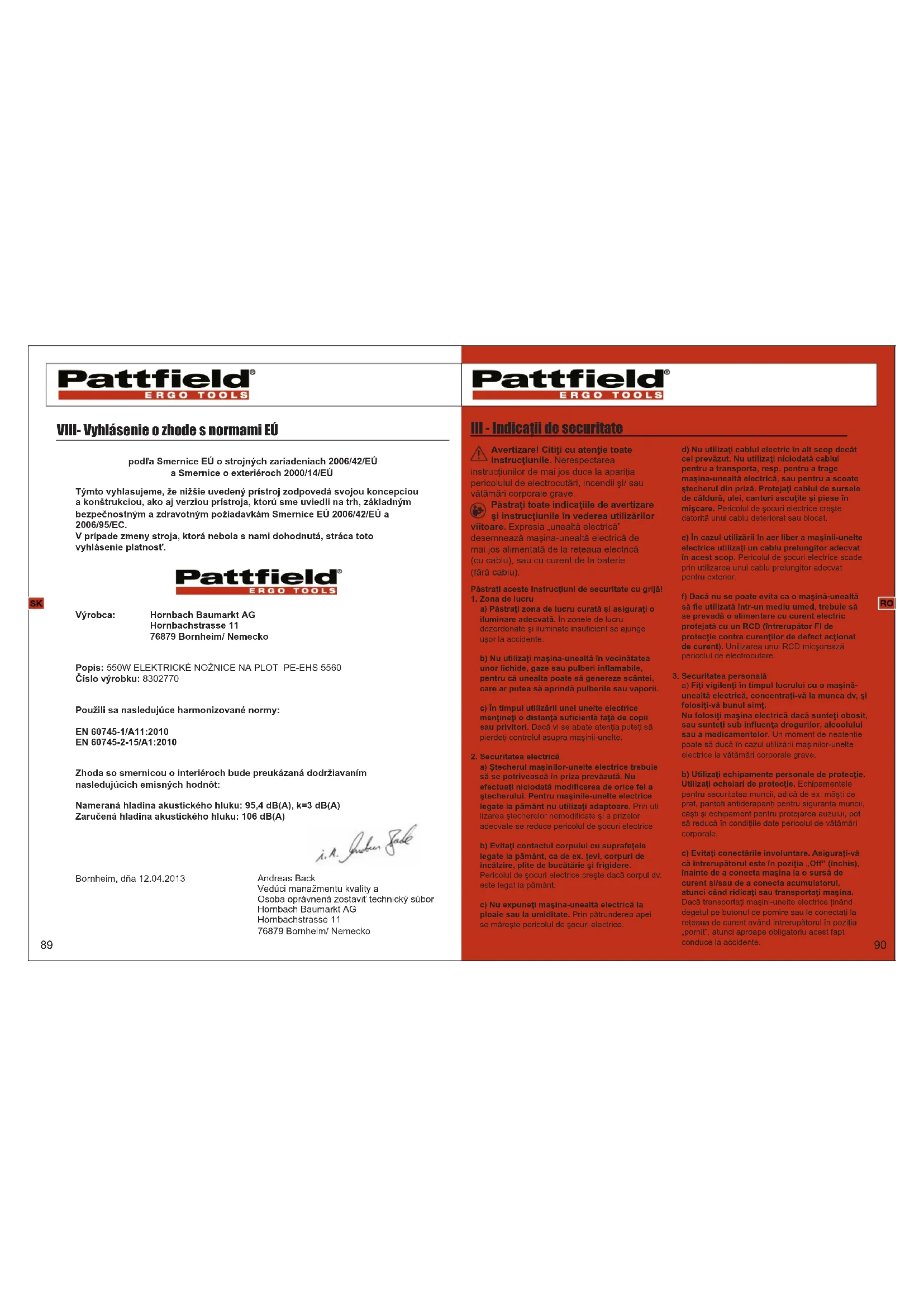 in conformitate cu directiva 2006/42/CE privind echipamentele tehnice si directiva 2000/14/CE privind zgomotul emis de echipamentele utilizez in exterior