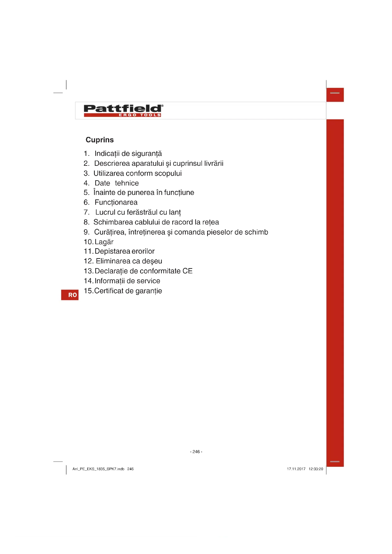 Respectaţi indicaţiile referitoare la ungere, tensionarea lanţului şi schimbarea pieselor auxiliare. Un lanţ tensionat sau uns neregulamentar, poate mări riscul ruperii sau al unui recul. Anl_PE_EKS_1835_SPK7.indb 252Anl_PE_EKS_1835_SPK7.indb 252 17.11.2017 12:33:2117.11.2017 12:33:21RO