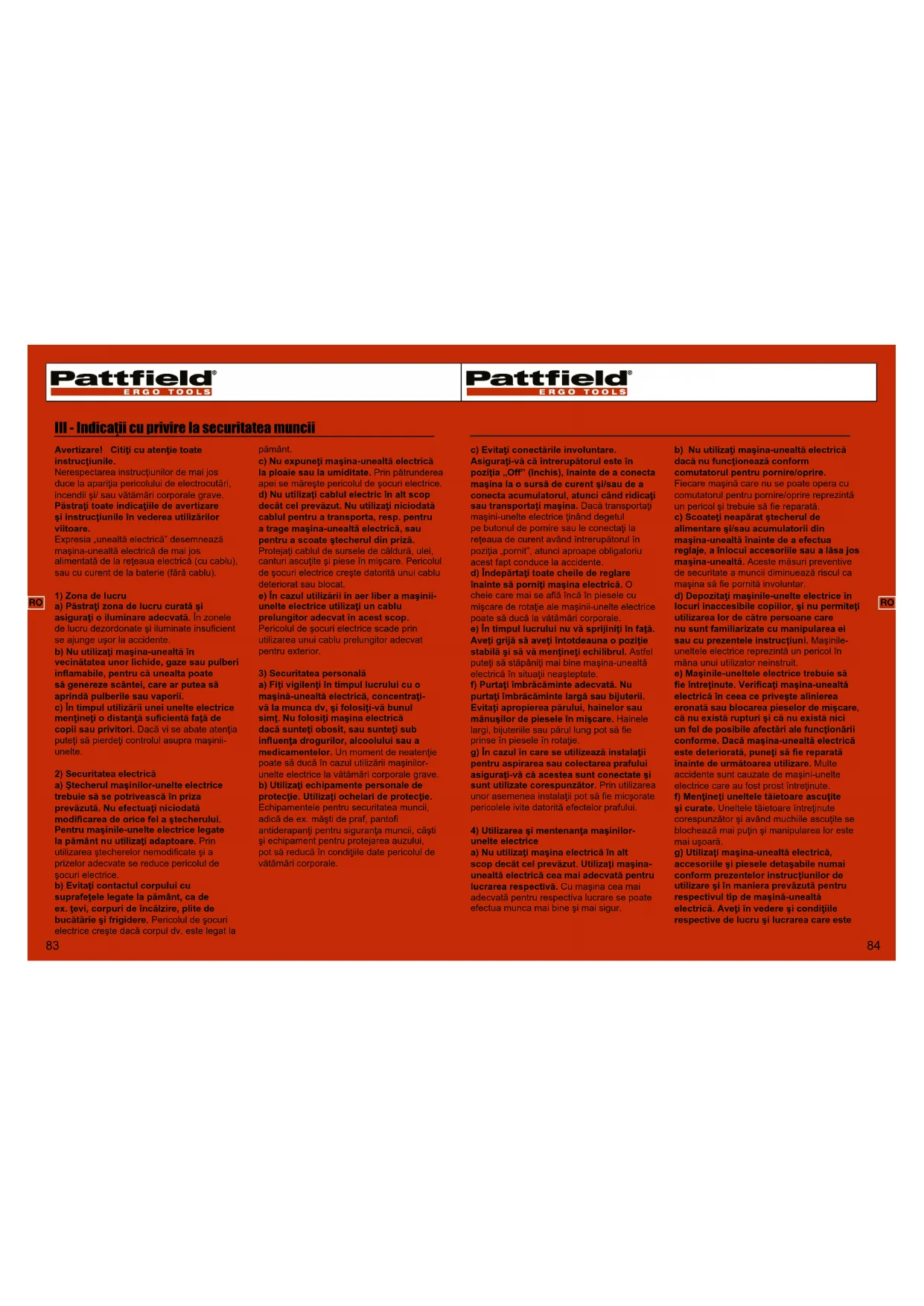 3) Securitatea personala a) Fiti vigilenti in timpul lucrului cu o masina-unealtacielectrica, concentra1va la munca dv, si folosi-vabunul simt. Nu folosi'masina eleclica dacuna sunteti obosit, sau sunteti sub influenta drogurilor, alcoholului sau amedicamentelor. Un moment de neattei poate sa duca in cazul utilizani masiniorunetele electrice lavatamari corporale grave. b)Utilizati' echipamente personale de protectie. Utilizati' ochelari de protectie. Echipamentele percute secutanea munciu, adica de ex.masi di praf.pantofi antiderapanti pertu siguranta munci,casti si echipamente pertu protejarea auzululi pot sa reduca in conditille date pericolul devatamari corporale.