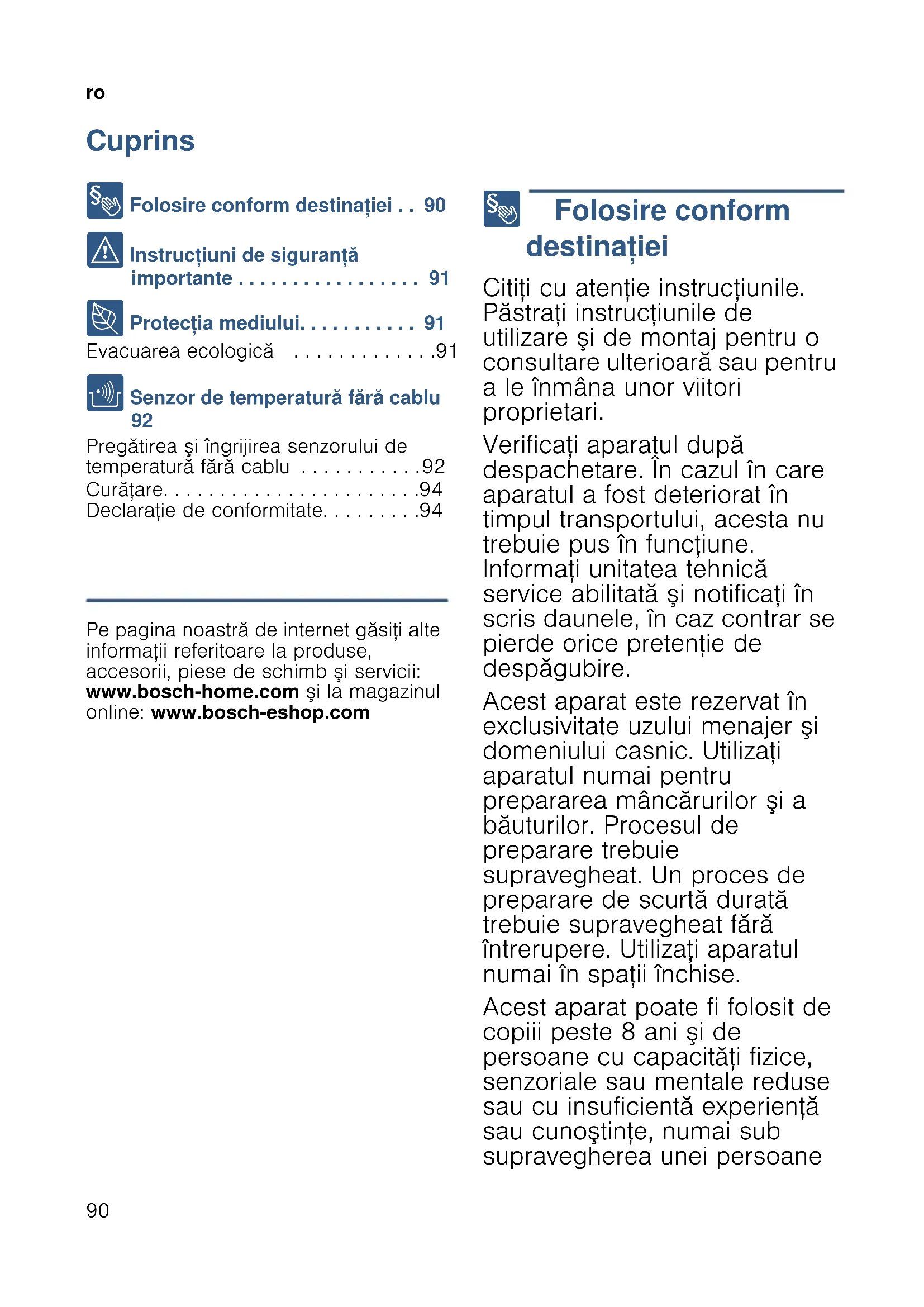 Pregătirea şi îngrijirea senzorului de temperatură fără cablu . . . . . . . . . . .92 Curăţare. . . . . . . . . . . . . . . . . . . . . . .94 Declaraţie de conformitate. . . . . . . . .94 Produktinfo Pe pagina noastră de internet găsiţi alte informaţii referitoare la produse, accesorii, piese de schimb şi servicii: www.bosch-home.com şi la magazinul online: www.bosch-eshop.com 8 Folosire conform destinaţiei Folosire conform destinaţiei Citiţi cu atenţie instrucţiunile. Păstraţi instrucţiunile de utilizare şi de montaj pentru o consultare ulterioară sau pentru a le înmâna unor viitori proprietari. Verificaţi aparatul după despachetare. În cazul în care aparatul a fost deteriorat în timpul transportului, acesta nu trebuie pus în funcţiune. Informaţi unitatea tehnică service abilitată şi notificaţi în scris daunele, în caz contrar se pierde orice pretenţie de despăgubire. Acest aparat este rezervat în exclusivitate uzului menajer şi domeniului casnic. Utilizaţi aparatul numai pentru prepararea mâncărurilor şi a băuturilor. Procesul de preparare trebuie supravegheat. Un proces de preparare de scurtă durată trebuie supravegheat fără întrerupere. Utilizaţi aparatul numai în spaţii închise. Acest aparat poate fi folosit de copiii peste 8 ani şi de persoane cu capacităţi fizice, senzoriale sau mentale reduse sau cu insuficientă experienţă sau cunoştinţe, numai sub supravegherea unei persoanero