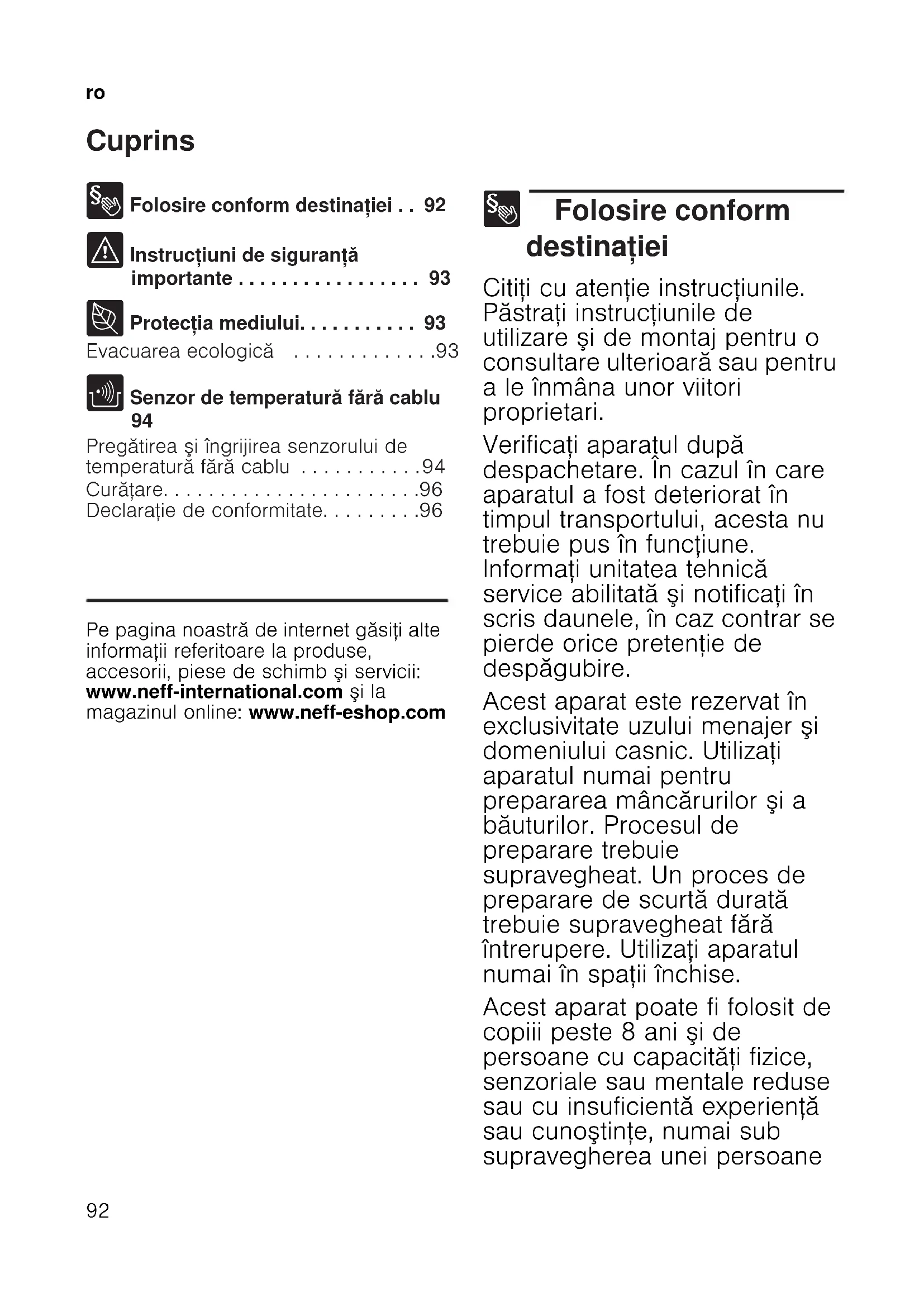 Pregătirea şi îngrijirea senzorului de temperatură fără cablu . . . . . . . . . . .94 Curăţare. . . . . . . . . . . . . . . . . . . . . . .96 Declaraţie de conformitate. . . . . . . . .96 Produktinfo Pe pagina noastră de internet găsiţi alte informaţii referitoare la produse, accesorii, piese de schimb şi servicii: www.neff-international.com şi la magazinul online: www.neff-eshop.com 8 Folosire conform destinaţiei Folosire conform destinaţiei Citiţi cu atenţie instrucţiunile. Păstraţi instrucţiunile de utilizare şi de montaj pentru o consultare ulterioară sau pentru a le înmâna unor viitori proprietari. Verificaţi aparatul după despachetare. În cazul în care aparatul a fost deteriorat în timpul transportului, acesta nu trebuie pus în funcţiune. Informaţi unitatea tehnică service abilitată şi notificaţi în scris daunele, în caz contrar se pierde orice pretenţie de despăgubire. Acest aparat este rezervat în exclusivitate uzului menajer şi domeniului casnic. Utilizaţi aparatul numai pentru prepararea mâncărurilor şi a băuturilor. Procesul de preparare trebuie supravegheat. Un proces de preparare de scurtă durată trebuie supravegheat fără întrerupere. Utilizaţi aparatul numai în spaţii închise. Acest aparat poate fi folosit de copiii peste 8 ani şi de persoane cu capacităţi fizice, senzoriale sau mentale reduse sau cu insuficientă experienţă sau cunoştinţe, numai sub supravegherea unei persoanero