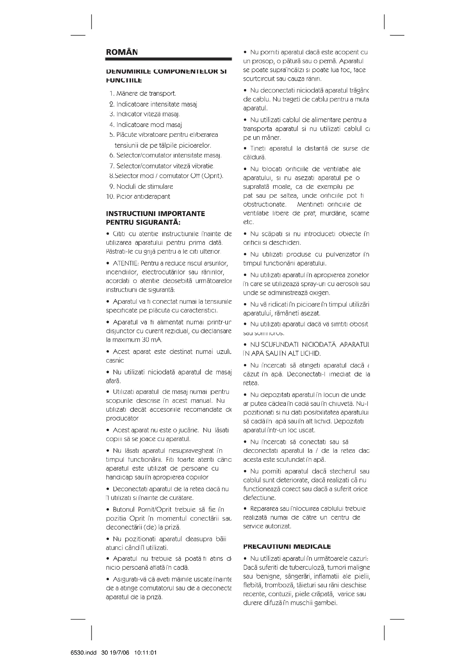 - Nu utilizati aparatul în urmãtoarele cazuri: Dacã suferiti de tuberculozã, tumori maligne sau benigne, sângerãri, inflamatii ale pielii, flebitã, trombozã, tãieturi sau rãni deschise recente, contuzii, piele crãpatã, varice sau durere difuzã în muschii gambei. MJ6530.indd 30 19/7/06 10:11:01• Cereti sfatul medicului dvs. dacã aveti îndoieli cu privire la utilizarea în scop terapeutic a aparatului.