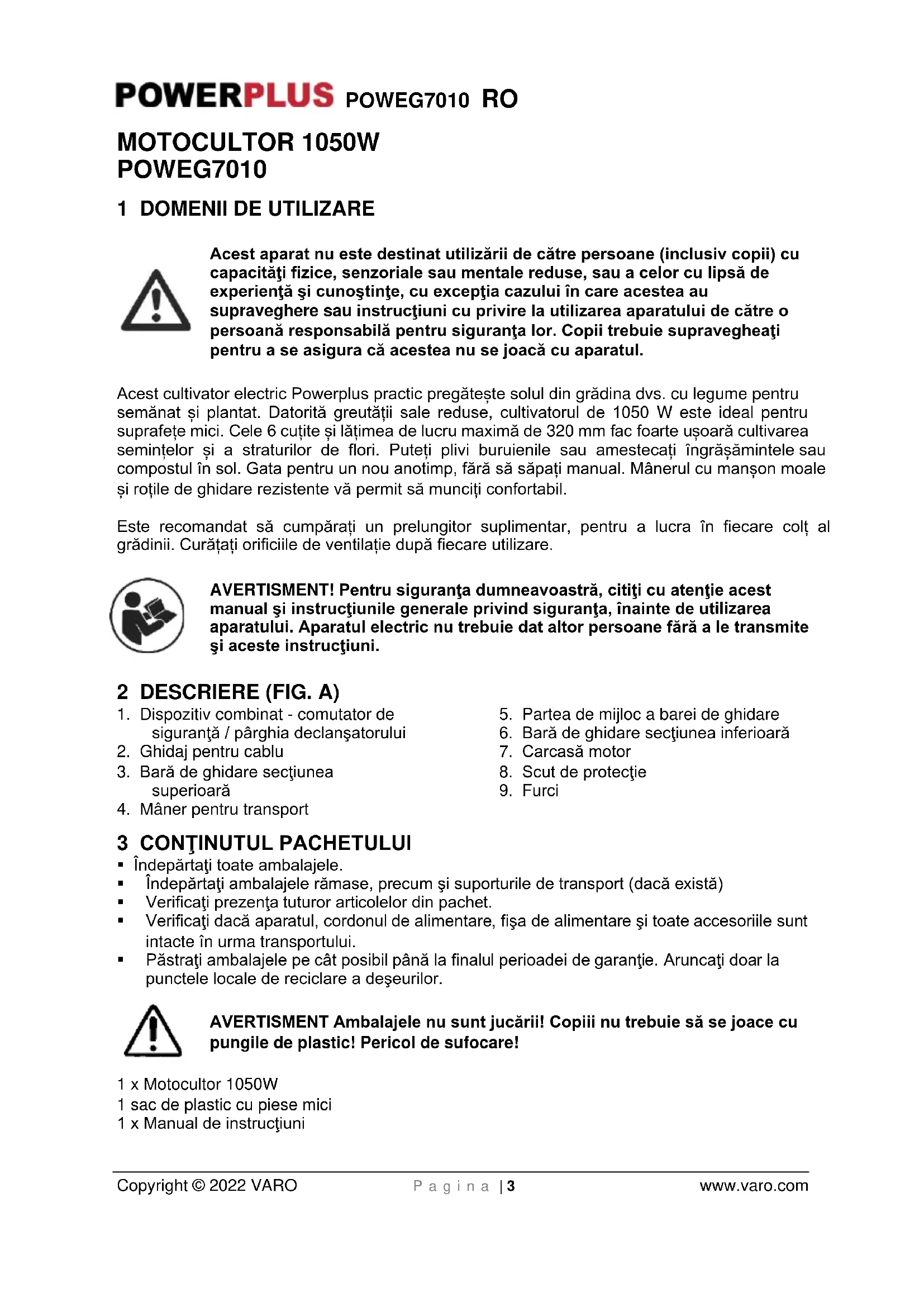 - Înainte de a băga mufa în priza de curent, asiguraţi-vă că categoria prizei este corectă şi corespunde cu cele indicate pe eticheta de clasare pe aparat.POWEG7010 RO Copyright © 2022 VARO P a g i n a | 7 www.varo.com