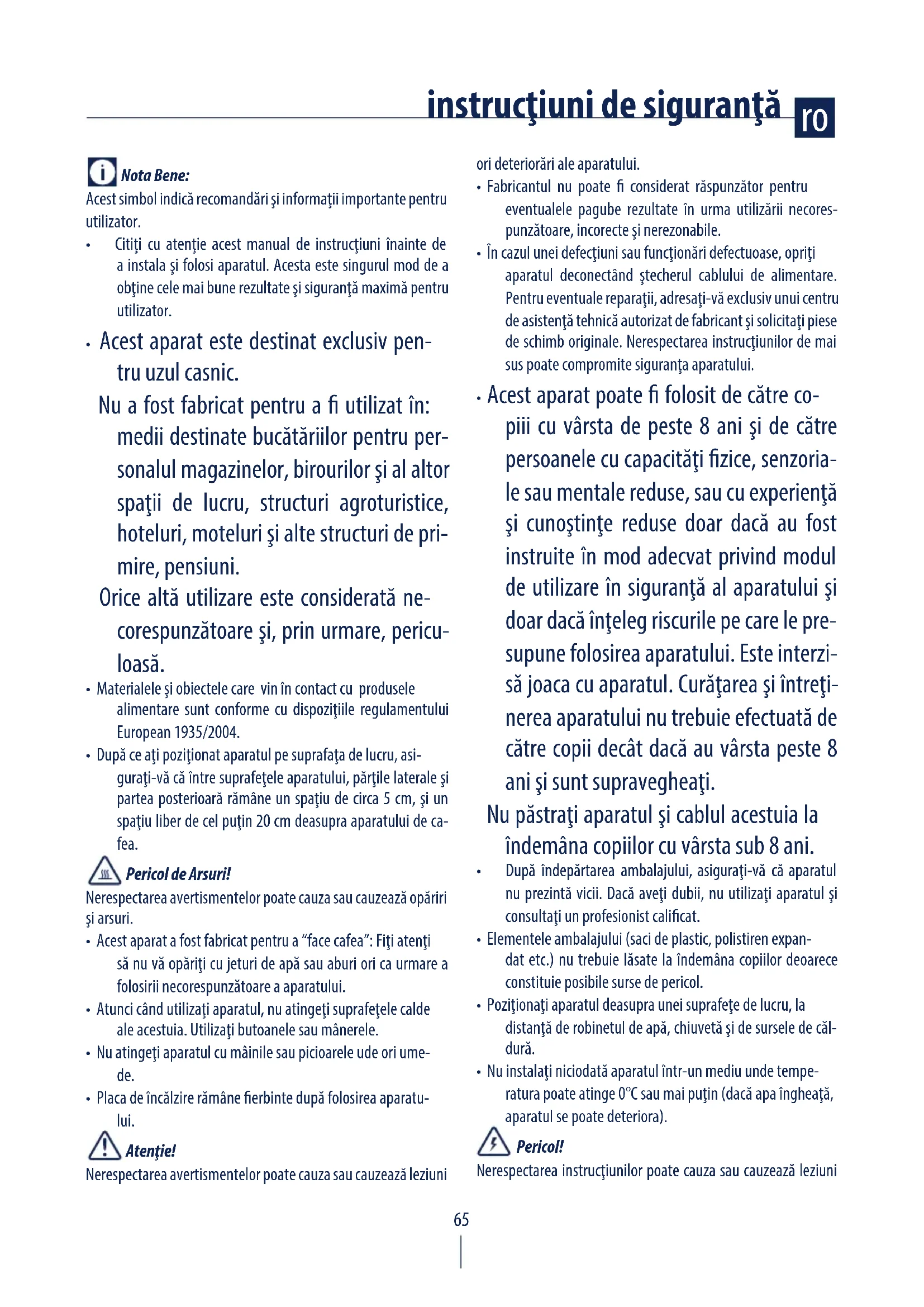 - Acest aparat a fost fabricat pentru a “face cafea”: Fiţi atenţi să nu vă opăriţi cu jeturi de apă sau aburi ori ca urmare a folosirii necorespunzătoare a aparatului.