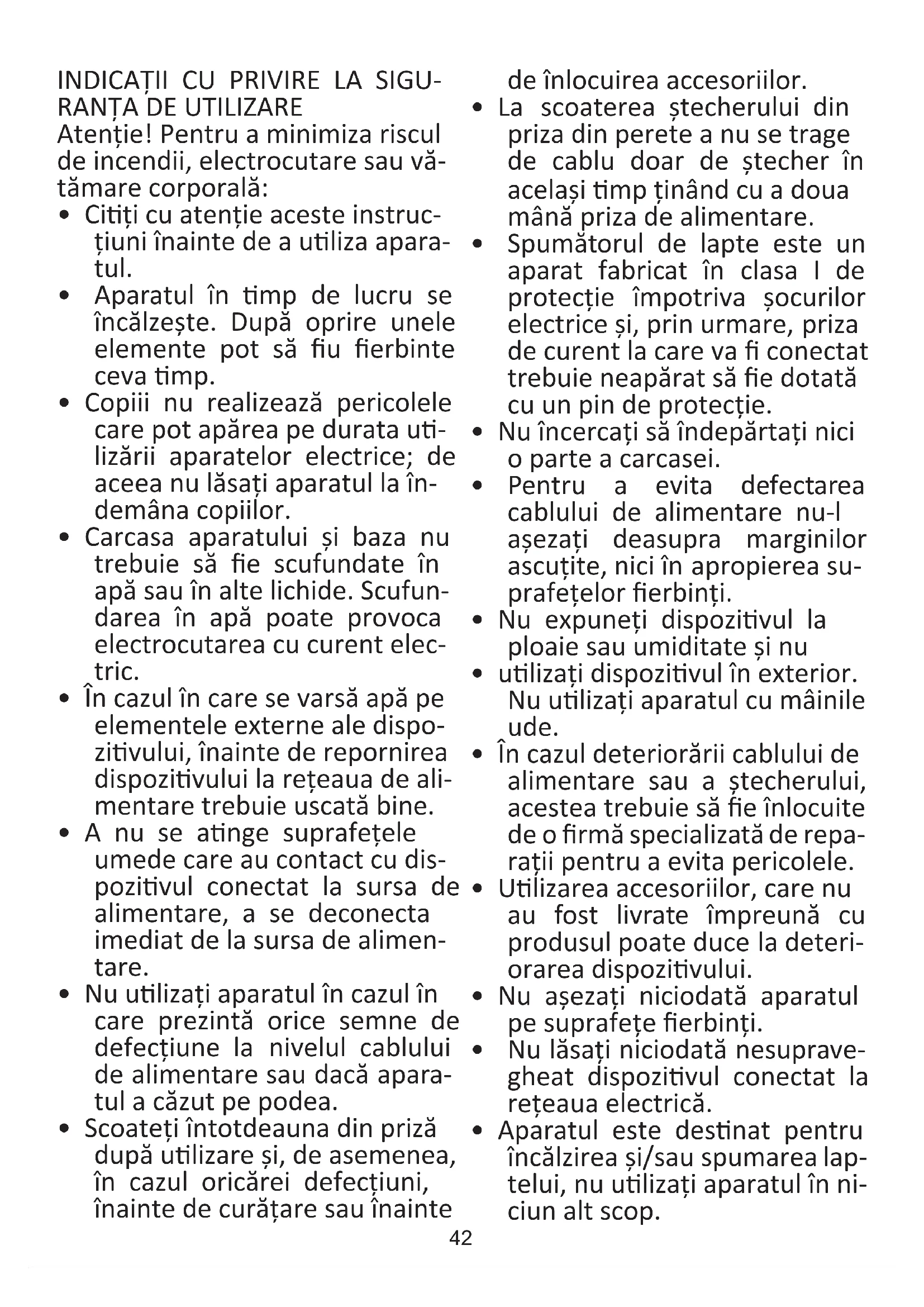 - Spumătorul de lapte este un aparat fabricat în clasa I de protecție împotriva șocurilor electrice și, prin urmare, priza de curent la care va conectat trebuie neapărat să e dotată cu un pin de protecție.