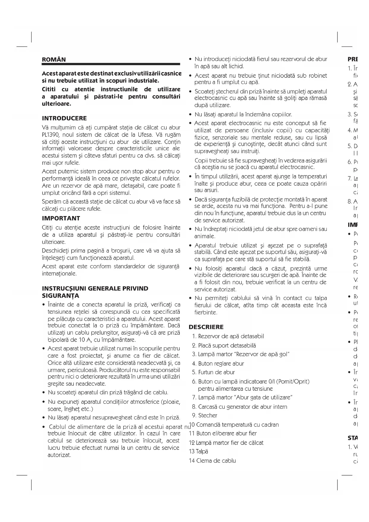 - Ако звукът не спре, не използвайте генератора на пара и се свържете с лицензиран сервизен център. Ако горепосочените съвети не решат проблема, се свържете с лицензиран технически сервизен център.ROMÂN Acest aparat este destinat exclusiv utilizării casnice si nu trebuie utilizat în scopuri industriale. Cititi cu atentie instructiunile de utilizare a aparatului şi păstrati-le pentru consultări ulterioare. INTRODUCERE Vă mulţumim că aţi cumpărat staţia de călcat cu abur PL1390, noul sistem de călcat de la Ufesa. Vă rugăm să citiţi aceste instrucţiuni cu abur de utilizare. Conţin informaţii valoroase despre caracteristicile unice ale acestui sistem şi câteva sfaturi pentru ca dvs. să călcaţi mai uşor rufele. Acest puternic sistem produce non stop abur pentru o performanţă ideală în ceea ce priveşte călcatul rufelor. Are un rezervor de apă mare, detaşabil, care poate fi umplut oricând fără a opri sistemul. Sperăm că această staţie de călcat cu abur vă va face să călcaţi cu plă cere rufele. IMPORTANT Citiţi cu atenţie aceste instrucţiuni de folosire înainte de a utiliza aparatul şi păstraţi-le pentru consultări ulterioare. Deschideţi prima pagină a broşurii, care vă va ajuta să înţelegeţi cum funcţionează aparatul. Acest aparat este conform standardelor de siguranţă internaţionale.
