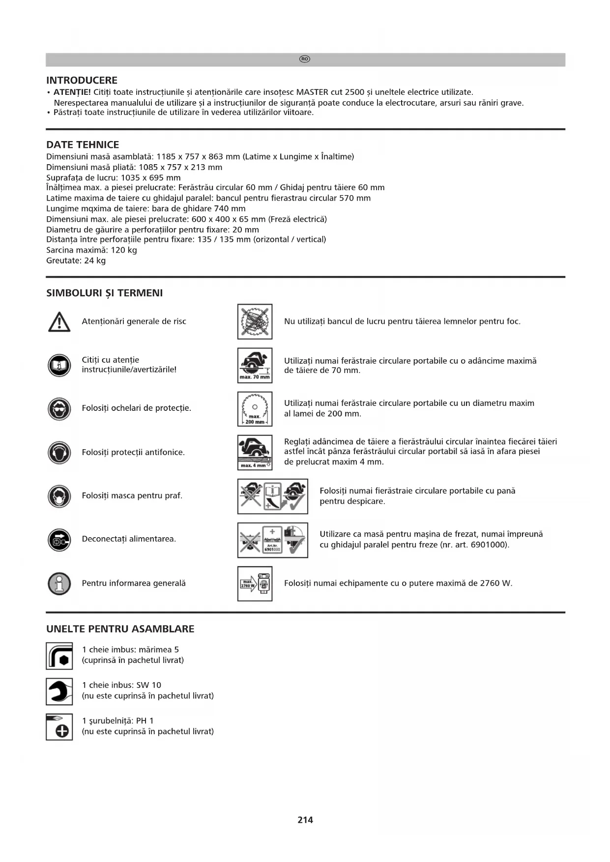 - ATENŢIE! Citiţi toate instrucţiunile și atenţionările care insoţesc MASTER cut 2500 și uneltele electrice utilizate. Nerespectarea manualului de utilizare și a instrucţiunilor de siguranţă poate conduce la electrocutare, arsuri sau răniri grave.