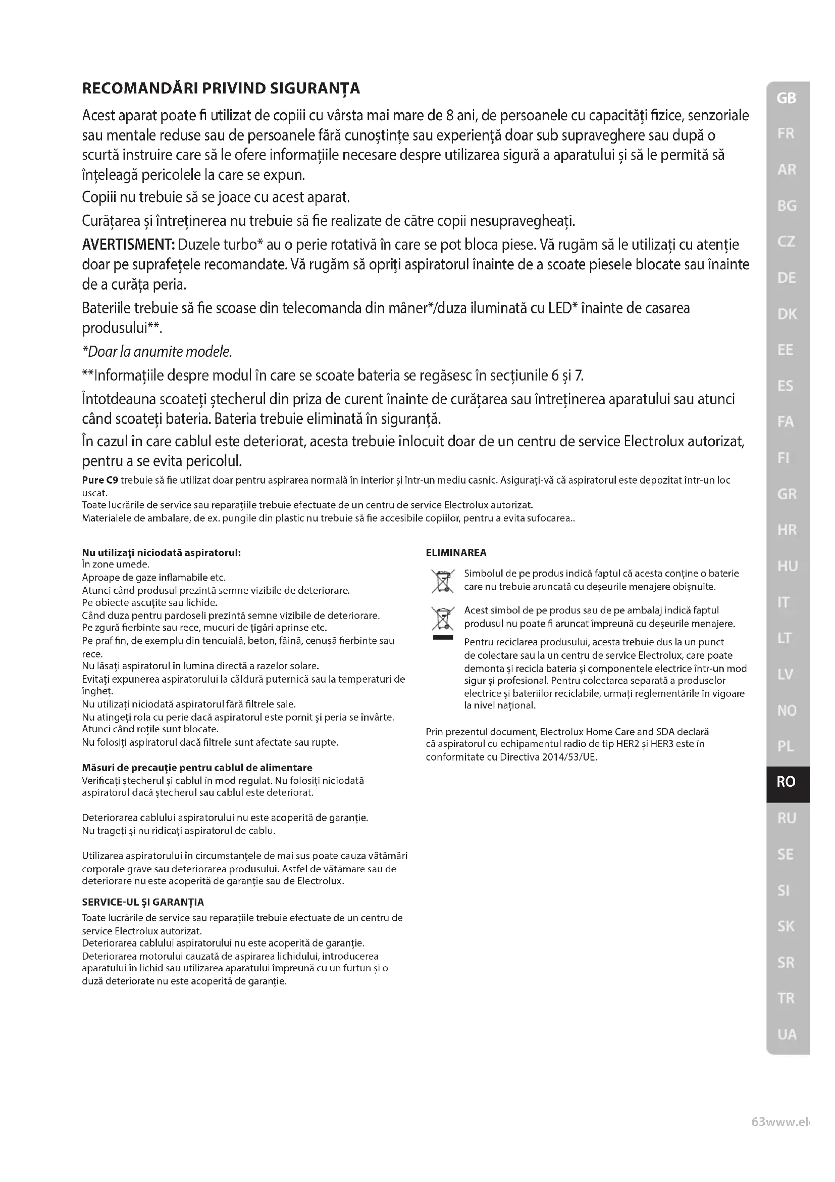 Toate lucrările de service sau reparațiile trebuie efectuate de un centru de service Electrolux autorizat. Deteriorarea cablului aspiratorului nu este acoperită de garanție. Deteriorarea motorului cauzată de aspirarea lichidului, introducerea aparatului în lichid sau utilizarea aparatului împreună cu un furtun și o duză deteriorate nu este acoperită de garanție. ELIMINAREA Simbolul de pe produs indică faptul că acesta conține o baterie care nu trebuie aruncată cu deșeurile menajere obișnuite. Acest simbol de pe produs sau de pe ambalaj indică faptul produsul nu poate aruncat împreună cu deșeurile menajere. Pentru reciclarea produsului, acesta trebuie dus la un punct de colectare sau la un centru de service Electrolux, care poate demonta și recicla bateria și componentele electrice într-un mod sigur și profesional. Pentru colectarea separată a produselor electrice și bateriilor reciclabile, urmați reglementările în vigoare la nivel național. Prin prezentul document, Electrolux Home Care and SDA declară că aspiratorul cu echipamentul radio de tip HER2 și HER3 este în conformitate cu Directiva 2014/53/UE.