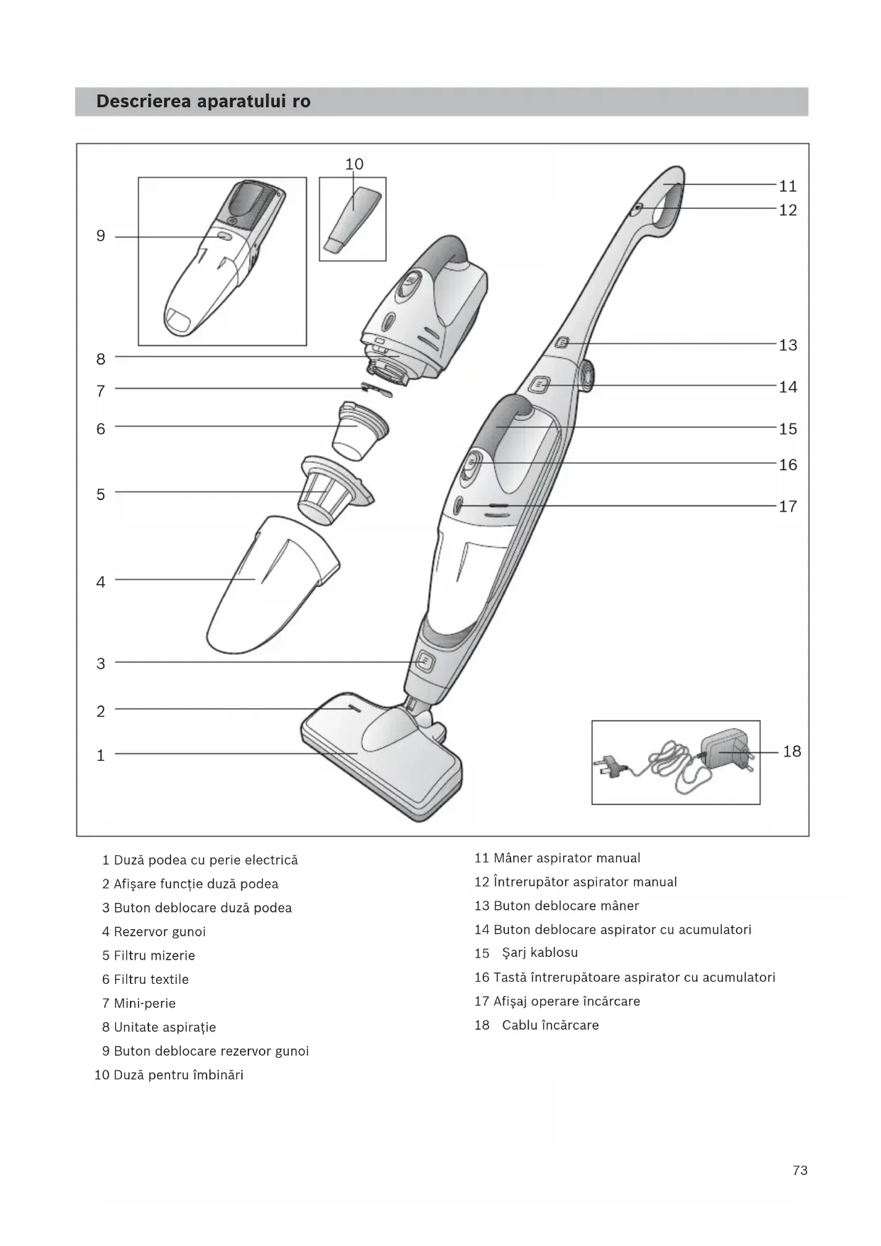 1 Duză podea cu perie electrică 2 Afişare funcţie duză podea 3 Buton deblocare duză podea 4 Rezervor gunoi 5 Filtru mizerie 6 Filtru textile 7 Mini-perie 8 Unitate aspiraţie 9 Buton deblocare rezervor gunoi 10 Duză pentru îmbinări 11 Mâner aspirator manual 12 Întrerupător aspirator manual 13 Buton deblocare mâner 14 Buton deblocare aspirator cu acumulatori 15 Mâner aspirator cu acumulatori 16 Tastă întrerupătoare aspirator cu acumulatori 17 Afişaj operare încărcare 18 Staţie de încărcare 19 Suport podea staţie încărcare 20 Cablu încărcare Şarj kablosu Descrierea aparatului ro Cablu încărcare74