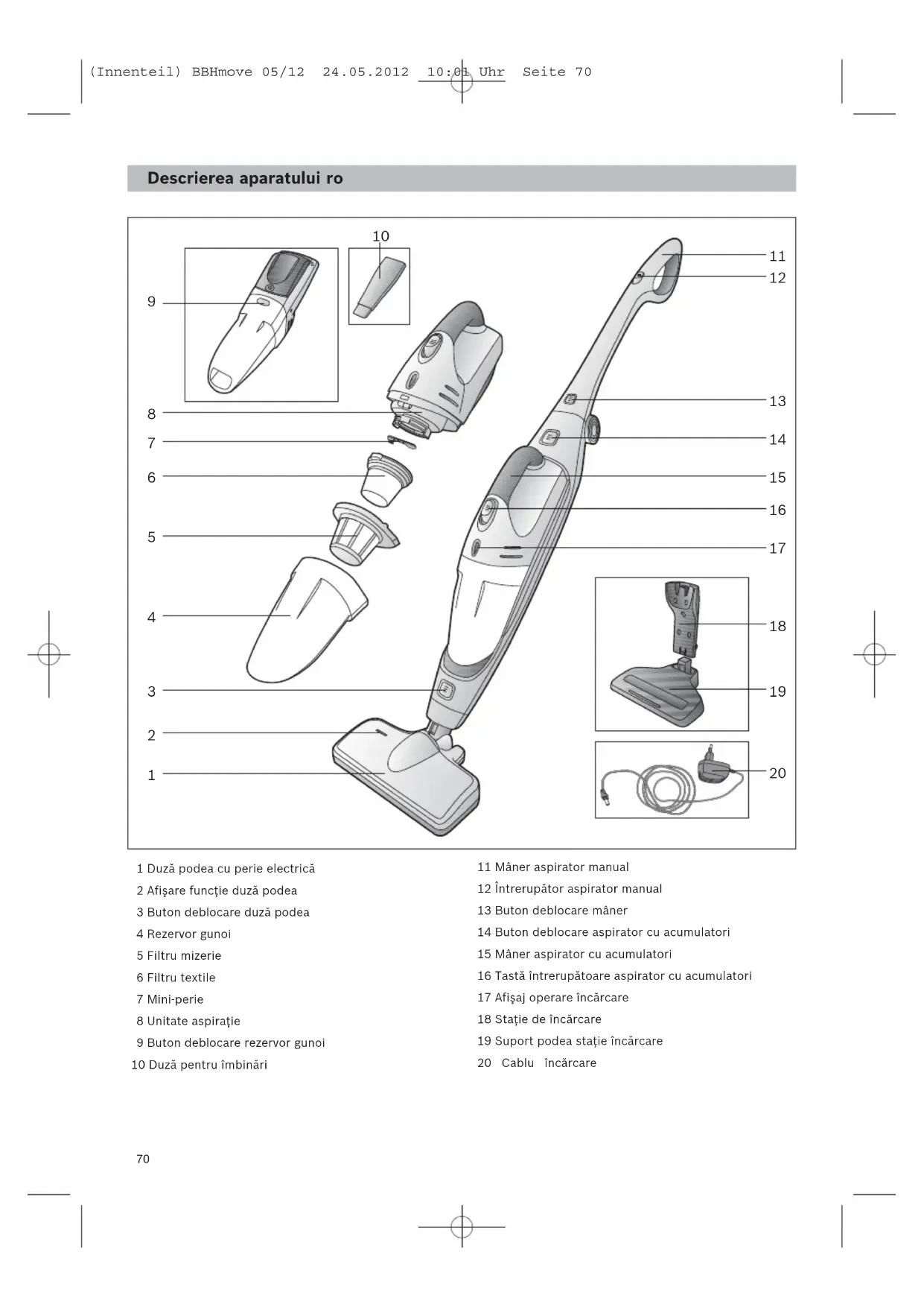 (Innenteil) BBHmove 05/12 24.05.2012 10:01 Uhr Seite 6970 Descrierea aparatului ro 1 Duză podea cu perie electrică 2 Afişare funcţie duză podea 3 Buton deblocare duză podea 4 Rezervor gunoi 5 Filtru mizerie 6 Filtru textile 7 Mini-perie 8 Unitate aspiraţie 9 Buton deblocare rezervor gunoi 10 Duză pentru îmbinări 11 Mâner aspirator manual 12 Întrerupător aspirator manual 13 Buton deblocare mâner 14 Buton deblocare aspirator cu acumulatori 15 Mâner aspirator cu acumulatori 16 Tastă întrerupătoare aspirator cu acumulatori 17 Afişaj operare încărcare 18 Staţie de încărcare 19 Suport podea staţie încărcare 20 Cablu încărcare