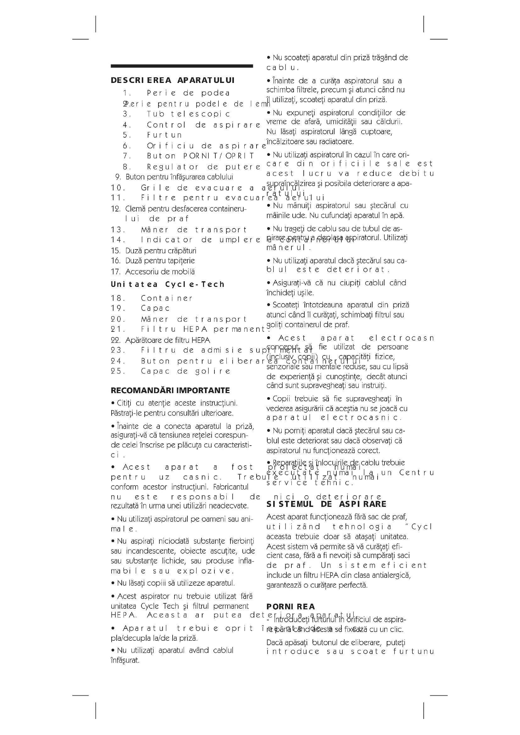 - Acest aspirator nu trebuie utilizat fără unitatea Cycle Tech şi filtrul permanent HEPA.Aceastaarputeadeterioraaparatul.