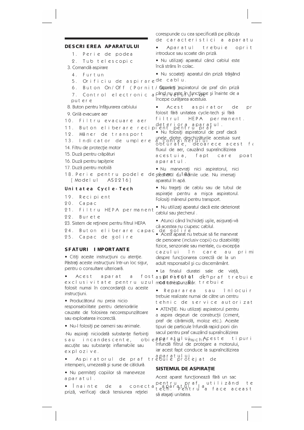 - Acest aspirator de praf nu poate fi folosit fără unitatea cycle-tech şi fără filtrul HEPA permanent. Aceasta poate deteriora aparatul.
