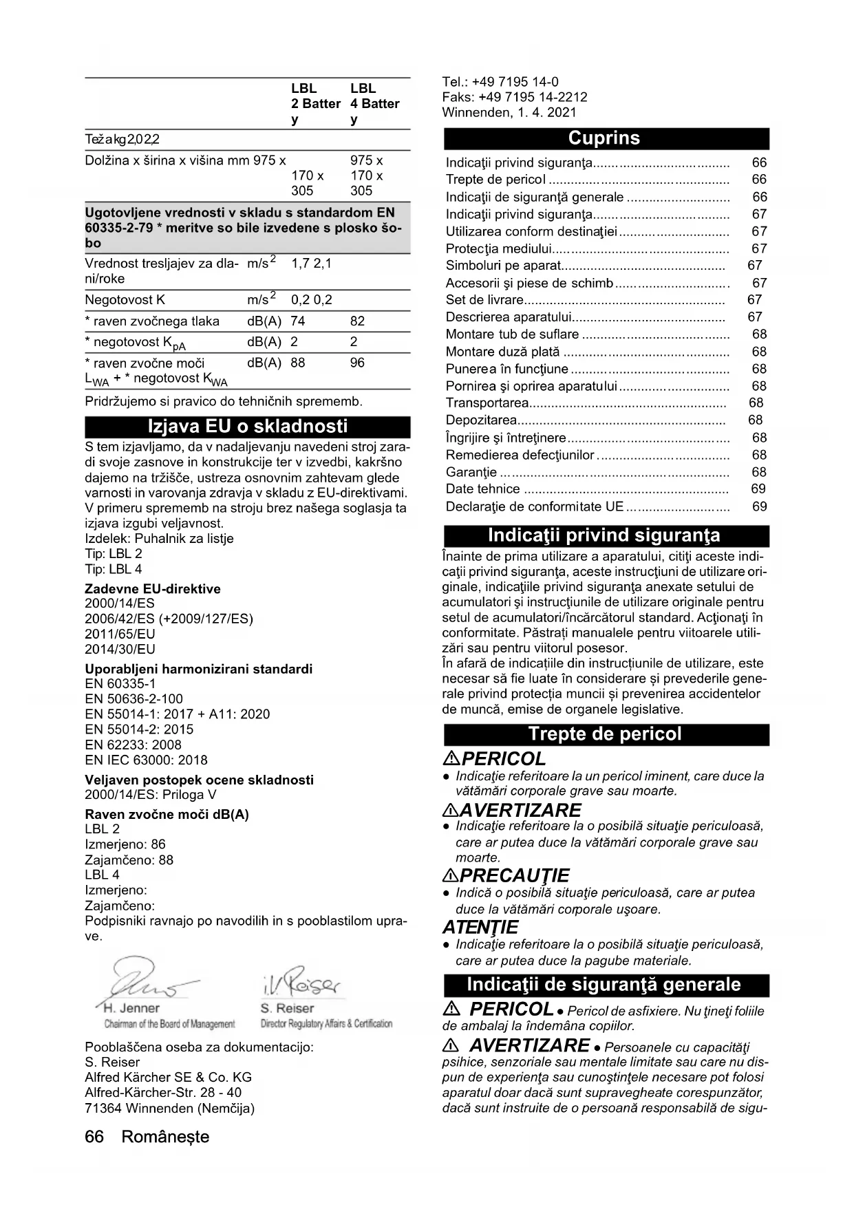 Aparatul se oprește în timpul funcționării Acumulatorul este supraîncălzit Întrerupeți lucrul și lăsați acumulatorul să se răceas- că sub domeniul de temperatură admis. Aceasta poate dura câteva minute. Garanţie În fiecare țară sunt valabile condițiile de garanție acor- date de distribuitorul nostru din țara respectivă. Eventu- ale defecțiuni survenite la aparat în perioada de garanție vor fi remediate gratuit, în limita în care sunt defecțiuni de fabricație sau de material. Pentru a bene- ficia de garanție, prezentați-vă cu chitanța de cumpăra- re la comerciantul dvs. sau la cea mai apropiată unitate de service autorizată. (Pentru adresă, consultați pagina din spate)Hrvatski 69 Pentru mai multe informații privind garanția (dacă sunt disponibile) vă rugăm accesați meniul „Descărcări” din opțiunea Service al paginii web al reprezentanței Kär- cher din țara dvs. Date tehnice Sub rezerva modificărilor tehnice. Declaraţie de conformitate UE Prin prezenta, declarăm că aparatul indicat mai jos co- respunde cerinţelor fundamentale privind siguranţa şi sănătatea prevăzute în directivele UE relevante, prin proiectarea și construcția sa, precum și în versiunea co- mercializată de noi. În cazul efectuării unei modificări a aparatului care nu a fost convenită cu noi, această de- claraţie îşi pierde valabilitatea. Produs: Suflantă de frunze Tip: LBL 2 Tip: LBL 4 Directive UE relevante 2000/14/UE 2006/42/UE (+2009/127/UE) 2011/65/UE 2014/30/UE Norme armonizate aplicate EN 60335-1 EN 50636-2-100 EN 55014-1: 2017 + A11: 2020 EN 55014-2: 2015 EN 62233: 2008 EN IEC 63000: 2018 Procedura aplicată de evaluare a conformităţii 2000/14/UE: Anexa V Nivel de putere acustică dB(A) LBL 2 Măsurat: 86 Garantat: 88 LBL 4 Măsurat: Garantat: Semnatarii acţionează în numele şi prin împuternicirea Consiliului director. Însărcinat cu elaborarea documentaţiei: S. Reiser Alfred Kärcher SE & Co. KG Alfred-Kärcher-Str. 28 - 40 71364 Winnenden (Germania) Tel.: +49 7195 14-0 Fax: +49 7195 14-2212 Winnenden, 2021/04/01 Sadržaj Sigurnosni napuci Prije prve uporabe uređaja pročitajte ove sigurnosne naputke, ove originalne upute za rad i sigurnosne na- putke priložene uz komplet baterija kao i priložene origi- nalne upute za rad za komplet baterija i punjač. Postupajte u skladu s njima. Čuvajte knjižice za kasniju uporabu ili za sljedećeg vlasnika. Osim naputaka u uputama za rad, morate uzeti u obzir i opće propise o sigurnosti i sprječavanju nezgoda koje je donio zakonodavac. Sigurnosne razine OPASNOST ● Uputa na neposredno prijeteću opasnosti koja bi mo- gla dovesti do teške ozljede ili smrti. LBL 2 Batter