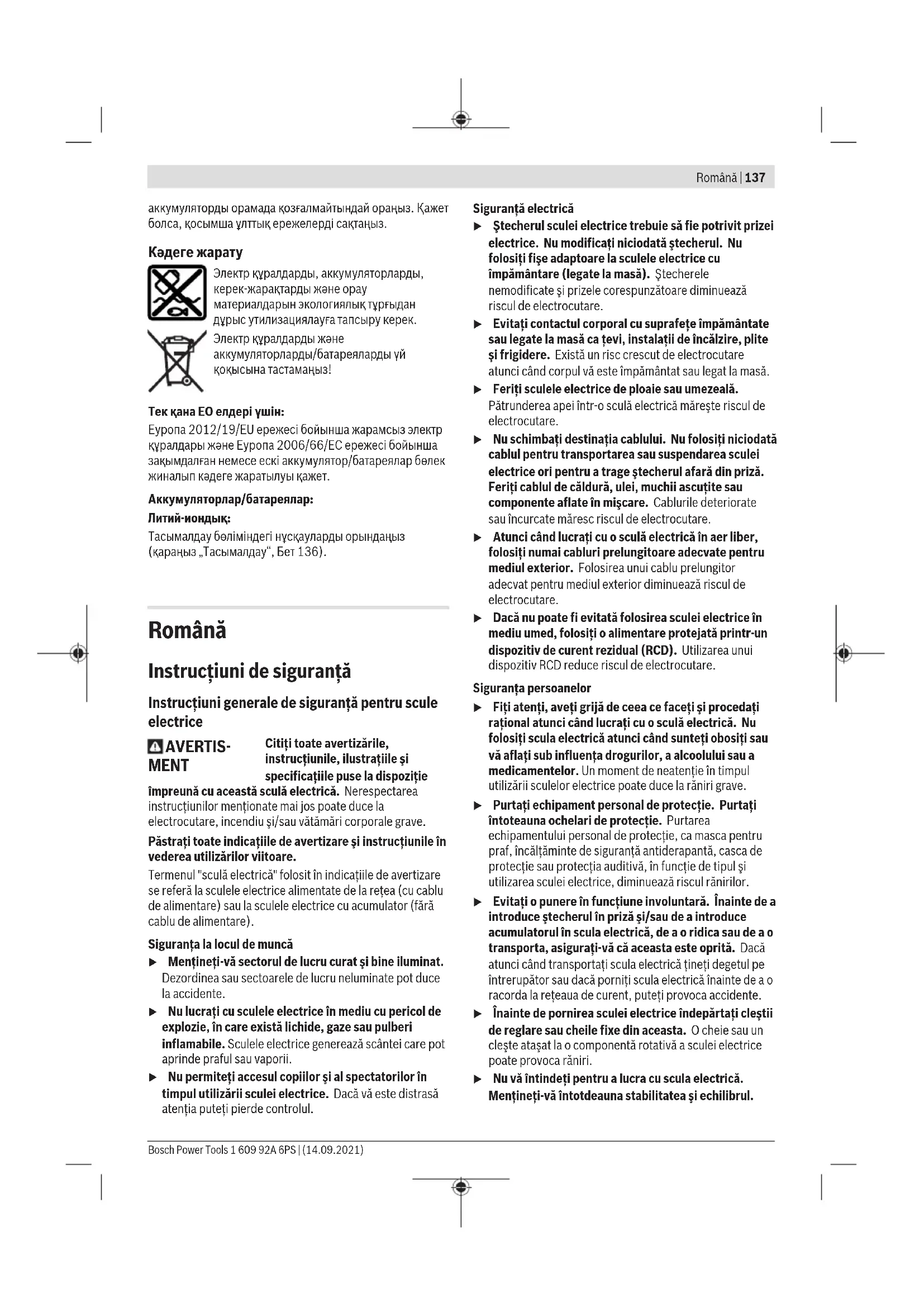 Бұл литий-иондық аккумуляторлар қауіпті тауарларға қойылатын талаптарға сай болуы керек. Пайдаланушы аккумуляторларды көшеде қосымша құжаттарсыз тасымалдай алады. Үшінші тұлғалар (мысалы, әуе көлігі немесе жіберу) орамаға және маркаларға қойылатын арнайы талаптарды сақтау керек. Жіберуге дайындау кезінде қауіпті жүктерді тасымалдау маманымен хабарласу керек. Аккумуляторды корпусы зақымдалған болса ғана жіберіңіз. Ашық түйіспелерді желімдеңіз және 1 609 92A 6PS | (14.09.2021) Bosch Power ToolsRomână | 137 аккумуляторды орамада қозғалмайтындай ораңыз. Қажет болса, қосымша ұлттық ережелерді сақтаңыз. Кәдеге жарату Электр құралдарды, аккумуляторларды, керек-жарақтарды және орау материалдарын экологиялық тұрғыдан дұрыс утилизациялауға тапсыру керек. Электр құралдарды және аккумуляторларды/батареяларды үй қоқысына тастамаңыз! Тек қана ЕО елдері үшін: Еуропа 2012/19/EU ережесі бойынша жарамсыз электр құралдары және Еуропа 2006/66/EC ережесі бойынша зақымдалған немесе ескі аккумулятор/батареялар бөлек жиналып кәдеге жаратылуы қажет. Аккумуляторлар/батареялар: Литий-иондық: Тасымалдау бөліміндегі нұсқауларды орындаңыз (қараңыз „Тасымалдау“, Бет136). Română Instrucţiuni de siguranţă Instrucţiuni generale de siguranţă pentru scule electrice AVERTIS- MENT Citiţi toate avertizările, instrucţiunile, ilustraţiile şi specificaţiile puse la dispoziţie împreună cu această sculă electrică. Nerespectarea instrucţiunilor menţionate mai jos poate duce la electrocutare, incendiu şi/sau vătămări corporale grave. Păstraţi toate indicaţiile de avertizare şi instrucţiunile în vederea utilizărilor viitoare. Termenul "sculă electrică" folosit în indicaţiile de avertizare se referă la sculele electrice alimentate de la reţea (cu cablu de alimentare) sau la sculele electrice cu acumulator (fără cablu de alimentare). Siguranţa la locul de muncă u Menţineţi‑vă sectorul de lucru curat şi bine iluminat. Dezordinea sau sectoarele de lucru neluminate pot duce la accidente. u Nu lucraţi cu sculele electrice în mediu cu pericol de explozie, în care există lichide, gaze sau pulberi inflamabile. Sculele electrice generează scântei care pot aprinde praful sau vaporii. u Nu permiteţi accesul copiilor şi al spectatorilor în timpul utilizării sculei electrice. Dacă vă este distrasă atenţia puteţi pierde controlul. Siguranţă electrică u Ştecherul sculei electrice trebuie să fie potrivit prizei electrice. Nu modificaţi niciodată ştecherul. Nu folosiţi fişe adaptoare la sculele electrice cu împământare (legate la masă). Ştecherele nemodificate şi prizele corespunzătoare diminuează riscul de electrocutare. u Evitaţi contactul corporal cu suprafeţe împământate sau legate la masă ca ţevi, instalaţii de încălzire, plite şi frigidere. Există un risc crescut de electrocutare atunci când corpul vă este împământat sau legat la masă. u Feriţi sculele electrice de ploaie sau umezeală. Pătrunderea apei într‑o sculă electrică măreşte riscul de electrocutare. u Nu schimbaţi destinaţia cablului. Nu folosiţi niciodată cablul pentru transportarea sau suspendarea sculei electrice ori pentru a trage ştecherul afară din priză. Feriţi cablul de căldură, ulei, muchii ascuţite sau componente aflate în mişcare. Cablurile deteriorate sau încurcate măresc riscul de electrocutare. u Atunci când lucraţi cu o sculă electrică în aer liber, folosiţi numai cabluri prelungitoare adecvate pentru mediul exterior. Folosirea unui cablu prelungitor adecvat pentru mediul exterior diminuează riscul de electrocutare. u Dacă nu poate fi evitată folosirea sculei electrice în mediu umed, folosiţi o alimentare protejată printr-un dispozitiv de curent rezidual (RCD). Utilizarea unui dispozitiv RCD reduce riscul de electrocutare. Siguranţa persoanelor u Fiţi atenţi, aveţi grijă de ceea ce faceţi şi procedaţi raţional atunci când lucraţi cu o sculă electrică. Nu folosiţi scula electrică atunci când sunteţi obosiţi sau vă aflaţi sub influenţa drogurilor, a alcoolului sau a medicamentelor. Un moment de neatenţie în timpul utilizării sculelor electrice poate duce la răniri grave. u Purtaţi echipament personal de protecţie. Purtaţi întoteauna ochelari de protecţie. Purtarea echipamentului personal de protecţie, ca masca pentru praf, încălţăminte de siguranţă antiderapantă, casca de protecţie sau protecţia auditivă, în funcţie de tipul şi utilizarea sculei electrice, diminuează riscul rănirilor. u Evitaţi o punere în funcţiune involuntară. Înainte de a introduce ştecherul în priză şi/sau de a introduce acumulatorul în scula electrică, de a o ridica sau de a o transporta, asiguraţi‑vă că aceasta este oprită. Dacă atunci când transportaţi scula electrică ţineţi degetul pe întrerupător sau dacă porniţi scula electrică înainte de a o racorda la reţeaua de curent, puteţi provoca accidente. u Înainte de pornirea sculei electrice îndepărtaţi cleştii de reglare s