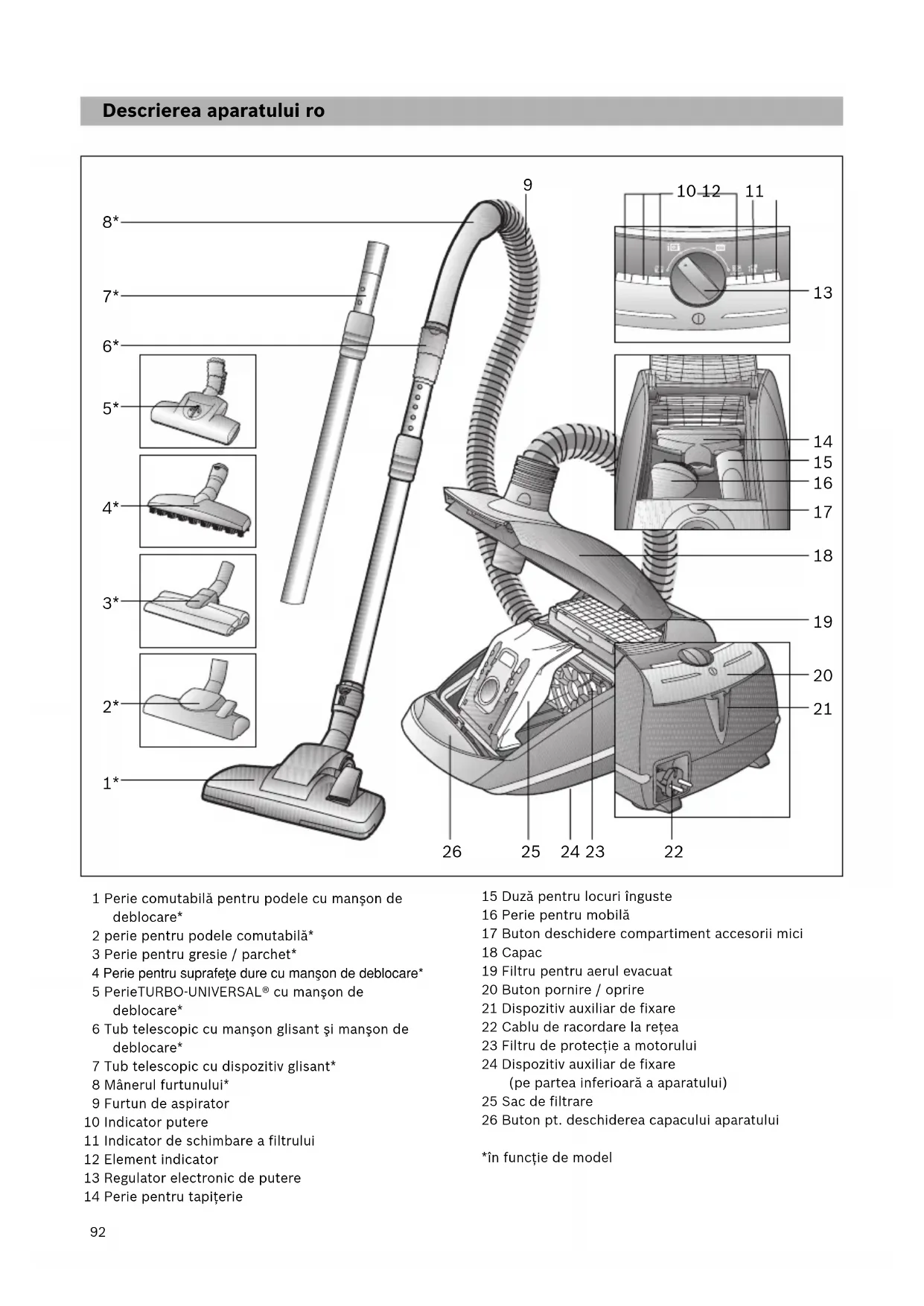 Mare Performanţe: Pentru curăţarea mochetelor robuste, a podelelor dure şi în cazul unui grad înalt de murdărire. b)Air Power: în cazul unui grad foarte înalt de murdărire şi impurităţi grobe. Aparatul aspiră cu puterea de aspirare maximă posibilă. Fig. Reglarea periei pentru podele: a)Pentru aspirarea covoarelor şi a mochetelor => b)Pentru aspirarea suprafaţelor dure => Atenţie! În funcţie de structura duşumelei (de ex. asperitate, gresie rustică), duzele de podea sunt supuse unei anumite uzuri. De aceea, trebuie să verificaţi la intervale regulate talpa duzei. Tălpile care sunt uzate şi prezintă muchii ascuţite pot provoca deteriorări pe duşumelele sensibile cum sunt parchetul sau linoleumul. Producătorul nu răspunde pentru eventuale prejudicii cauzate de uzura duzei de podea. Turboperie Dacă aparatul Dvx. este dotat cu o turboperie, atunci informaţiile referitoare la utilizare şi întreţinere le găsiţi în instrucţiunile de utilizare alăturate. Accesoriile mici care pentru moment nu Vă sunt necesare, pot fi depozitate comod în sertarul pentru accesorii de la capacul aparatului. Fig. La acţionarea butonului pt. deschidere capacul compartimentului pentru accesorii se deschide de la sine. Scoateţi accesoriile dorite.