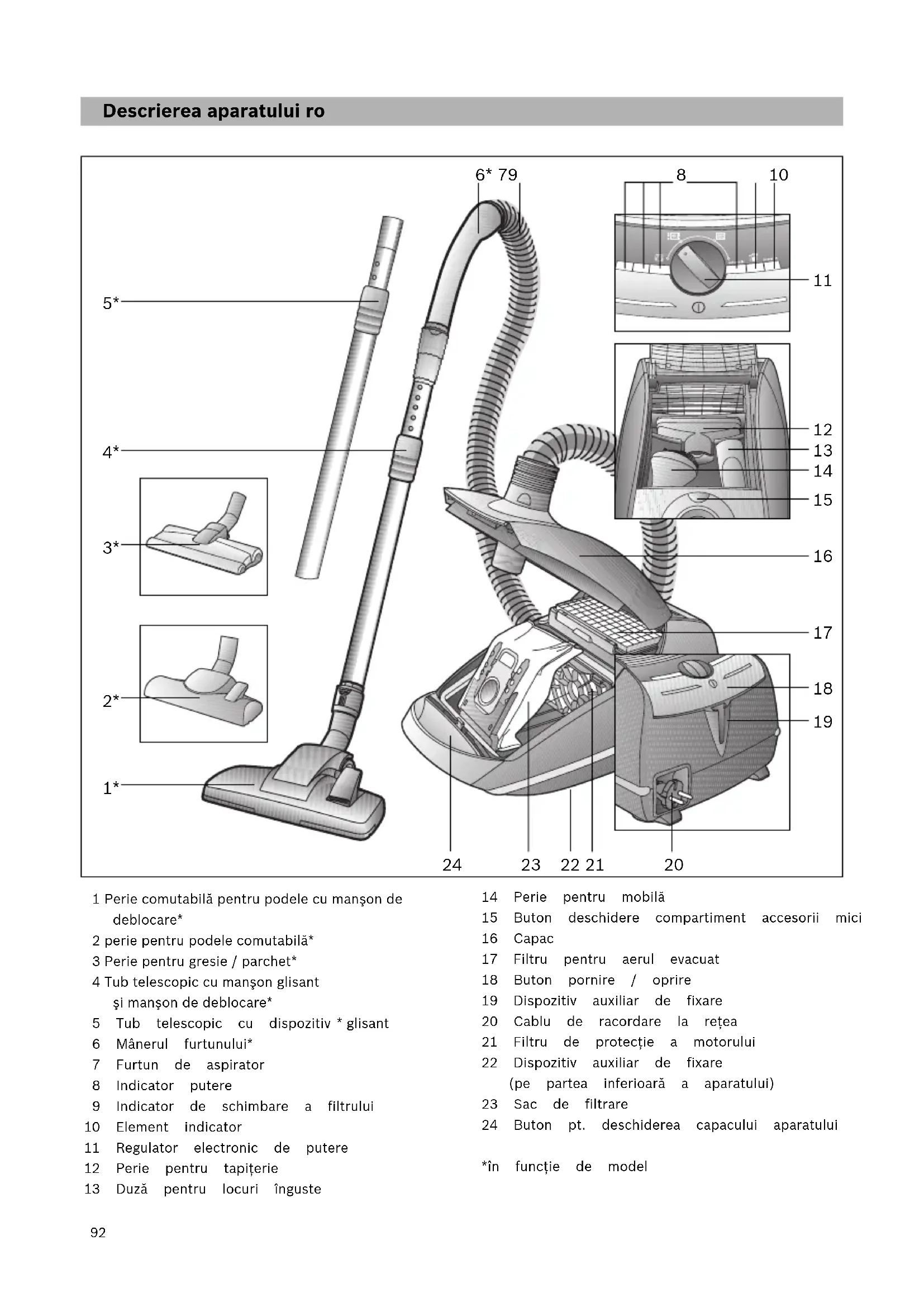 6 Mânerul furtunului* 7 Furtun de aspirator 8 Indicator putere 9 Indicator de schimbare a filtrului 10 Element indicator 11 Regulator electronic de putere 12 Perie pentru tapiţerie 13 Duză pentru locuri înguste 14 Perie pentru mobilă 15 Buton deschidere compartiment accesorii mici 16 Capac 17 Filtru pentru aerul evacuat 18 Buton pornire / oprire 19 Dispozitiv auxiliar de fixare 20 Cablu de racordare la reţea 21 Filtru de protecţie a motorului 22 Dispozitiv auxiliar de fixare (pe partea inferioară a aparatului) 23 Sac de filtrare 24 Buton pt. deschiderea capacului aparatului *în funcţie de model 6* 79