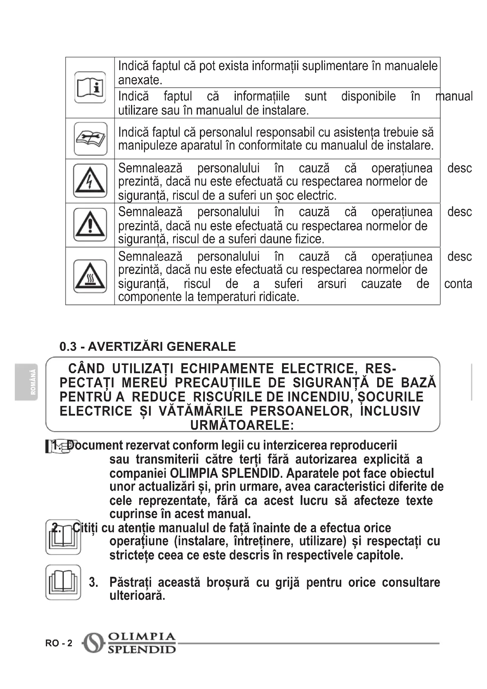 Indicăfaptulcădocumentuldefațătrebuiecititcuatențieînainte deinstalareași/sauutilizareaaparatului. Indicăfaptulcădocumentuldefațătrebuiecititcuatențieînainte deoriceoperațiunedeîntreținereși/saudecurățare. INDEX GENERAL