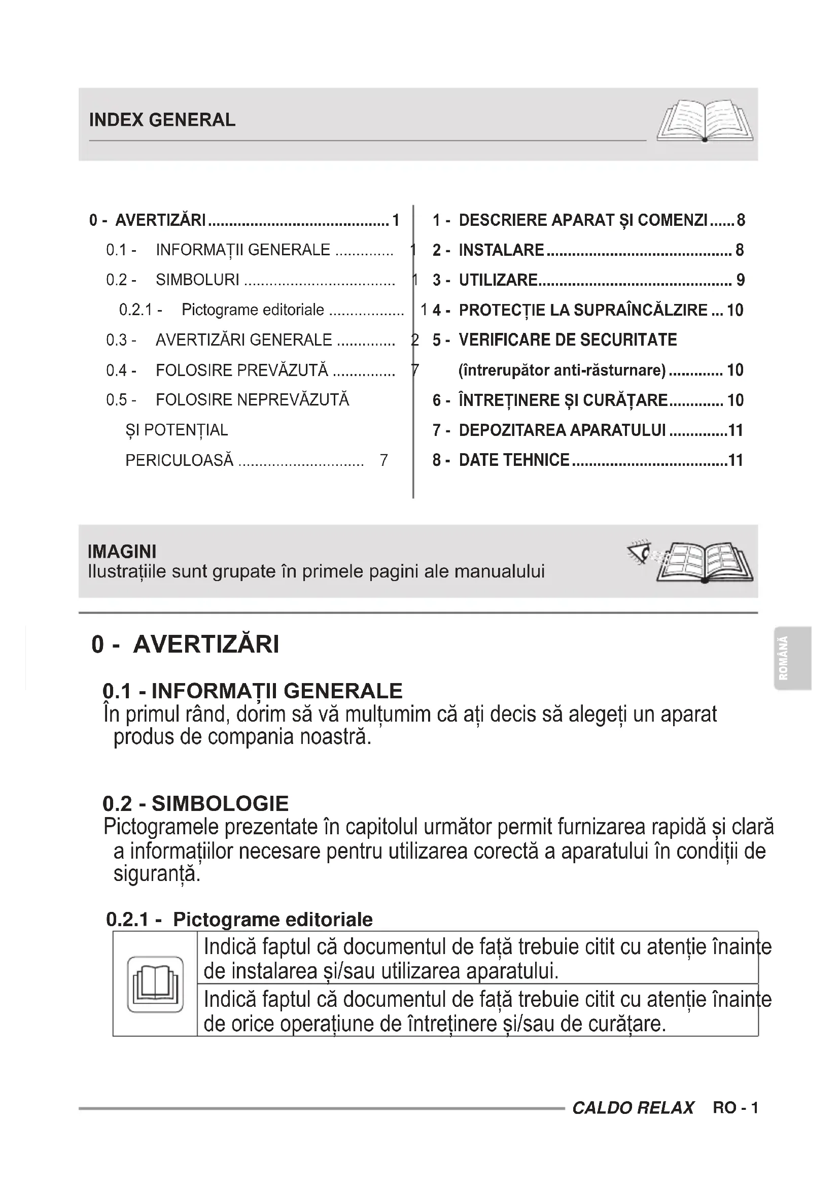 Indicăfaptulcădocumentuldefațătrebuiecititcuatențieînainte deinstalareași/sauutilizareaaparatului. Indicăfaptulcădocumentuldefațătrebuiecititcuatențieînainte deoriceoperațiunedeîntreținereși/saudecurățare. INDEX GENERAL