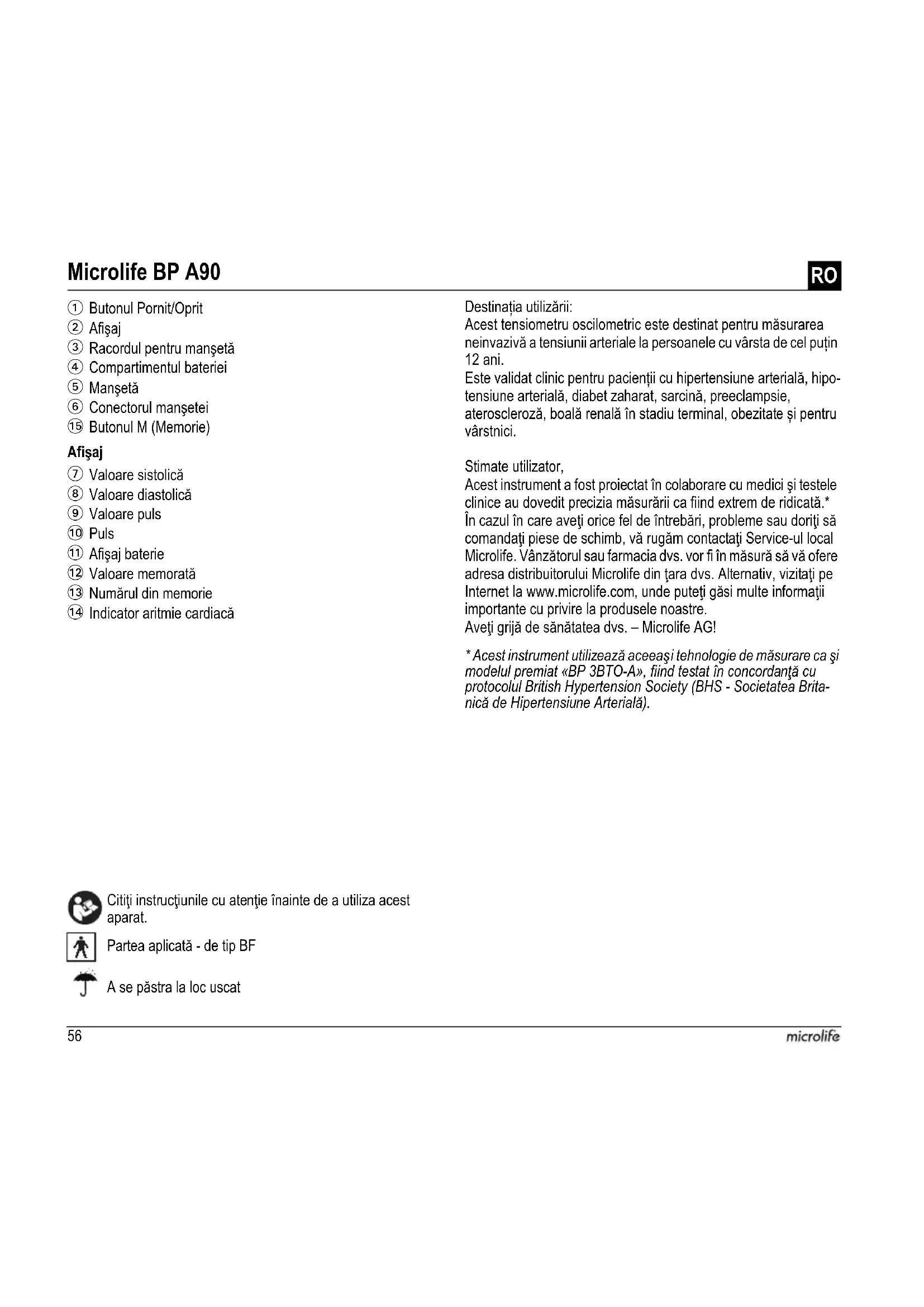 - Acest instrument utilizează aceeaş i tehnologie de măsurare ca şi modelul premiat «BP 3BTO-A», fiind testat în concordanţă cu protocolul British Hypertension Society (BHS - Societatea Brita- nică de Hipertensiune Arterială). Microlife BP A90