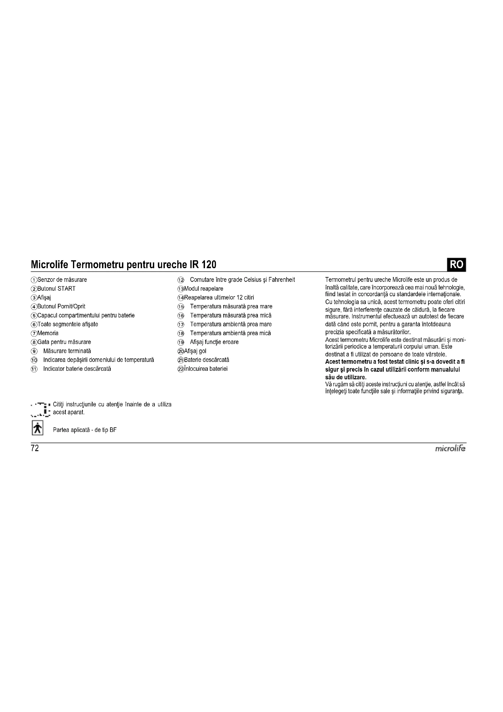 Citiţi instrucţiunile cu atenţie înainte de a utiliza acest aparat. Partea aplicată - de tip BF Termometrul pentru ureche Microlife este un produs de înaltă calitate, care încorporează cea mai nouă tehnologie, fiind testat în concordanţă cu standardele internaţionale. Cu tehnologia sa unică, acest termometru poate oferi citiri sigure, fără interferenţe cauzate de căldură, la fiecare măsurare. Instrumentul efectuează un autotest de fiecare dată când este pornit, pentru a garanta întotdeauna precizia specificată a măsurătorilor. Acest termometru Microlife este destinat măsurării şi moni- torizării periodice a temperaturii corpului uman. Este destinat a fi utilizat de persoane de toate vârstele. Acest termometru a fost testat clinic şi s-a dovedit a fi sigur şi precis în cazul utilizării conform manualului său de utilizare. Vă rugăm să citiţi aceste instrucţiuni cu atenţie, astfel încât să înţelegeţi toate funcţiile sale şi informaţiile privind siguranţa. Microlife Termometru pentru ureche IR 120
