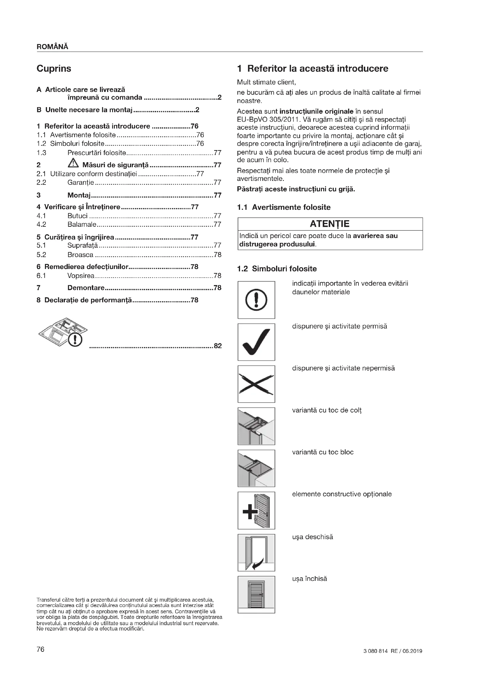 EΛΛΗΝΙΚΑ1 Referitor la această introducere Mult stimate client, ne bucurăm că aţi ales un produs de înaltă calitate al firmei noastre. Acestea sunt instrucţiunile originale în sensul EU-BpVO305/2011. Vă rugăm să citiţi şi să respectaţi aceste instrucţiuni, deoarece acestea cuprind informaţii foarte importante cu privire la montaj, acţionare cât şi despre corecta îngrijire/întreţinere a uşii adiacente de garaj, pentru a vă putea bucura de acest produs timp de mulţi ani de acum în colo. Respectaţi mai ales toate normele de protecţie şi avertismentele. Păstraţi aceste instrucţiuni cu grijă.