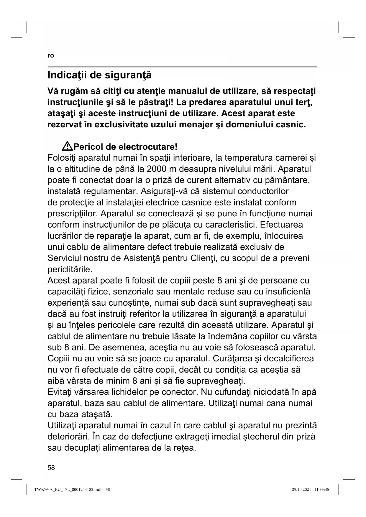 TWK760x_EU_17L_8001244182.indb 57TWK760x_EU_17L_8001244182.indb 57 29.10.2021 11:35:4429.10.2021 11:35:44Indicaţii de siguranţă Vă rugăm să citiţi cu atenţie manualul de utilizare, să respectaţi instrucţiunile şi să le păstraţi! La predarea aparatului unui terţ, ataşaţi şi aceste instrucţiuni de utilizare. Acest aparat este rezervat în exclusivitate uzului menajer şi domeniului casnic. WPericol de electrocutare! Folosiţi aparatul numai în spaţii interioare, la temperatura camerei şi la o altitudine de până la 2000 m deasupra nivelului mării. Aparatul poate conectat doar la o priză de curent alternativ cu pământare, instalată regulamentar. Asiguraţi-vă că sistemul conductorilor de protecţie al instalaţiei electrice casnice este instalat conform prescripţiilor. Aparatul se conectează şi se pune în funcţiune numai conform instrucţiunilor de pe plăcuţa cu caracteristici. Efectuarea lucrărilor de reparaţie la aparat, cum ar , de exemplu, înlocuirea unui cablu de alimentare defect trebuie realizată exclusiv de Serviciul nostru de Asistenţă pentru Clienţi, cu scopul de a preveni periclitările. Acest aparat poate folosit de copiii peste 8 ani şi de persoane cu capacităţi zice, senzoriale sau mentale reduse sau cu insucientă experienţă sau cunoştinţe, numai sub dacă sunt supravegheaţi sau dacă au fost instruiţi referitor la utilizarea în siguranţă a aparatului şi au înţeles pericolele care rezultă din această utilizare. Aparatul şi cablul de alimentare nu trebuie lăsate la îndemâna copiilor cu vârsta sub 8 ani. De asemenea, aceştia nu au voie să folosească aparatul. Copiii nu au voie să se joace cu aparatul. Curăţarea şi decalcierea nu vor efectuate de către copii, decât cu condiţia ca aceştia să aibă vârsta de minim 8 ani şi să e supravegheaţi. Evitaţi vărsarea lichidelor pe conector. Nu cufundaţi niciodată în apă aparatul, baza sau cablul de alimentare. Utilizaţi numai cana numai cu baza ataşată. Utilizaţi aparatul numai în cazul în care cablul şi aparatul nu prezintă deteriorări. În caz de defecţiune extrageţi imediat ştecherul din priză sau decuplaţi alimentarea de la reţea. WPericol de incendiu! Nu aşezaţi baza sau cana pe suprafeţele erbinţi, cum ar de exemplu placa aragazului, sau în apropierea acestor suprafeţe. Împiedică sărirea stropilor de grăsime, însă materialul plastic se poate deteriora. WPericol de opărire! Aparatul se încinge în timpul utilizării. Din această cauză se va prinde doar de mâner, iar capacul se va deschide numai dacă s-a răcit. Utilizaţi aparatul numai cu capacul xat prin blocare. Dacă se umple aparatul deasupra marcajului „max”, ar putea lua naştere un pericol din cauza stropirii cu apă clocotită. WPericol de arsuri! După utilizare, suprafeţele rezistenţei de încălzire mai pot erbinţi puţin timp.