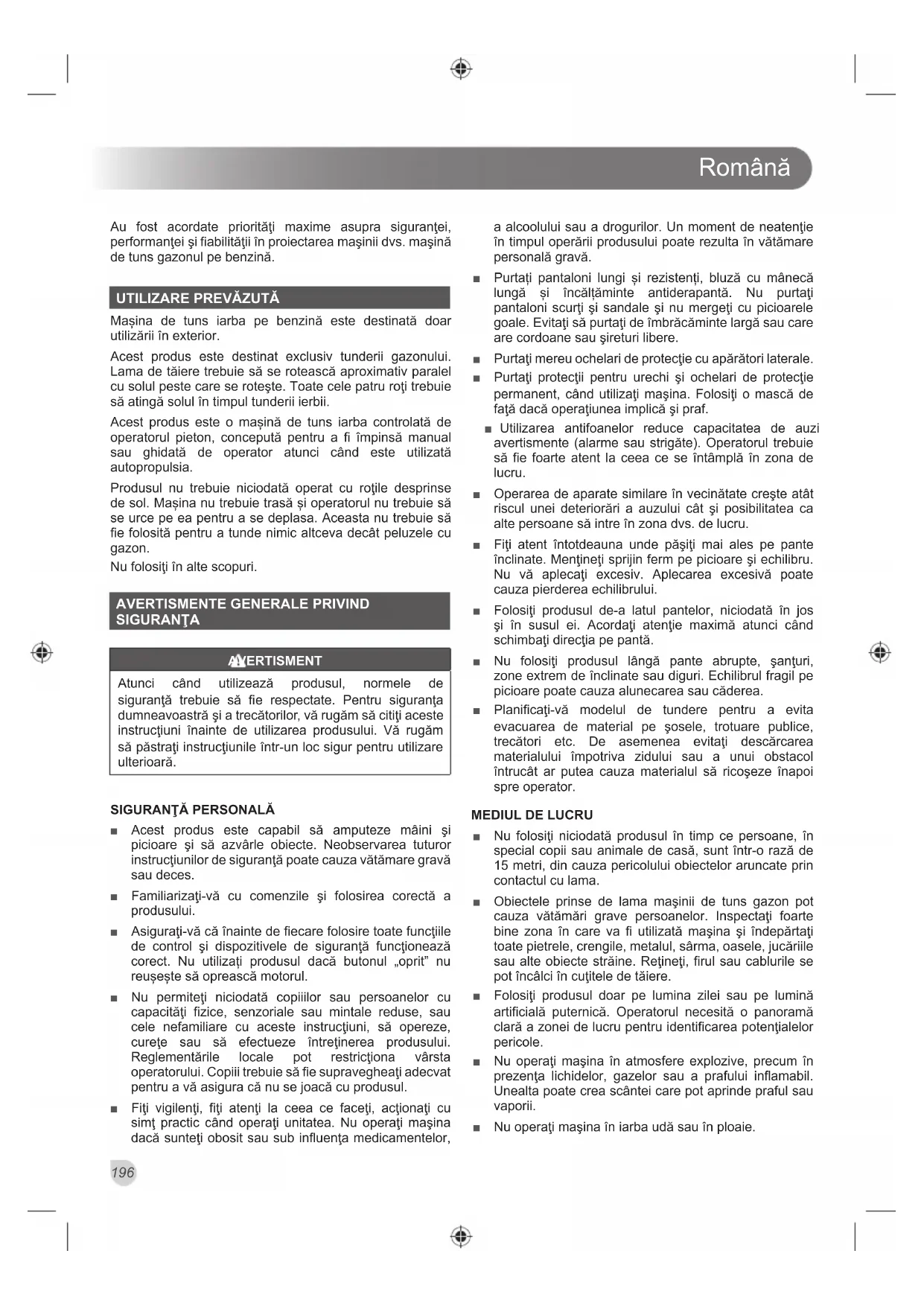 SIGURANŢA AVERTISMENT Atunci când utilizează produsul, normele de siguranţă trebuie să fi e respectate. Pentru siguranţa dumneavoastră şi a trecătorilor, vă rugăm să citiţi aceste instrucţiuni înainte de utilizarea produsului. Vă rugăm să păstraţi instrucţiunile într-un loc sigur pentru utilizare ulterioară. SIGURANŢĂ PERSONALĂ ■ Acest produs este capabil să amputeze mâini şi picioare şi să azvârle obiecte. Neobservarea tuturor instrucţiunilor de siguranţă poate cauza vătămare gravă sau deces. ■ Familiarizaţi-vă cu comenzile şi folosirea corectă a produsului. ■ Asiguraţi-vă că înainte de fiecare folosire toate funcţiile de control şi dispozitivele de siguranţă funcţionează corect. Nu utilizați produsul dacă butonul „oprit” nu reușește să oprească motorul. ■ Nu permiteţi niciodată copiiilor sau persoanelor cu capacităţi fizice, senzoriale sau mintale reduse, sau cele nefamiliare cu aceste instrucţiuni, să opereze, cureţe sau să efectueze întreţinerea produsului. Reglementările locale pot restricţiona vârsta operatorului. Copiii trebuie să fie supravegheaţi adecvat pentru a vă asigura că nu se joacă cu produsul. ■ Fiţi vigilenţi, fiţi atenţi la ceea ce faceţi, acţionaţi cu simţ practic când operaţi unitatea. Nu operaţi maşina dacă sunteţi obosit sau sub influenţa medicamentelor, a alcoolului sau a drogurilor. Un moment de neatenţie în timpul operării produsului poate rezulta în vătămare personală gravă. ■ Purtați pantaloni lungi și rezistenți, bluză cu mânecă lungă și încălțăminte antiderapantă. Nu purtaţi pantaloni scurţi şi sandale şi nu mergeţi cu picioarele goale. Evitaţi să purtaţi de îmbrăcăminte largă sau care are cordoane sau şireturi libere. ■ Purtaţi mereu ochelari de protecţie cu apărători laterale. ■ Purtaţi protecţii pentru urechi şi ochelari de protecţie permanent, când utilizaţi maşina. Folosiţi o mască de faţă dacă operaţiunea implică şi praf. ■ Utilizarea antifoanelor reduce capacitatea de auzi avertismente (alarme sau strigăte). Operatorul trebuie să fie foarte atent la ceea ce se întâmplă în zona de lucru. ■ Operarea de aparate similare în vecinătate creşte atât riscul unei deteriorări a auzului cât şi posibilitatea ca alte persoane să intre în zona dvs. de lucru. ■ Fiţi atent întotdeauna unde păşiţi mai ales pe pante înclinate. Menţineţi sprijin ferm pe picioare şi echilibru. Nu vă aplecaţi excesiv. Aplecarea excesivă poate cauza pierderea echilibrului. ■ Folosiţi produsul de-a latul pantelor, niciodată în jos şi în susul ei. Acordaţi atenţie maximă atunci când schimbaţi direcţia pe pantă. ■ Nu folosiţi produsul lângă pante abrupte, şanţuri, zone extrem de înclinate sau diguri. Echilibrul fragil pe picioare poate cauza alunecarea sau căderea. ■ Planificaţi-vă modelul de tundere pentru a evita evacuarea de material pe şosele, trotuare publice, trecători etc. De asemenea evitaţi descărcarea materialului împotriva zidului sau a unui obstacol întrucât ar putea cauza materialul să ricoşeze înapoi spre operator.