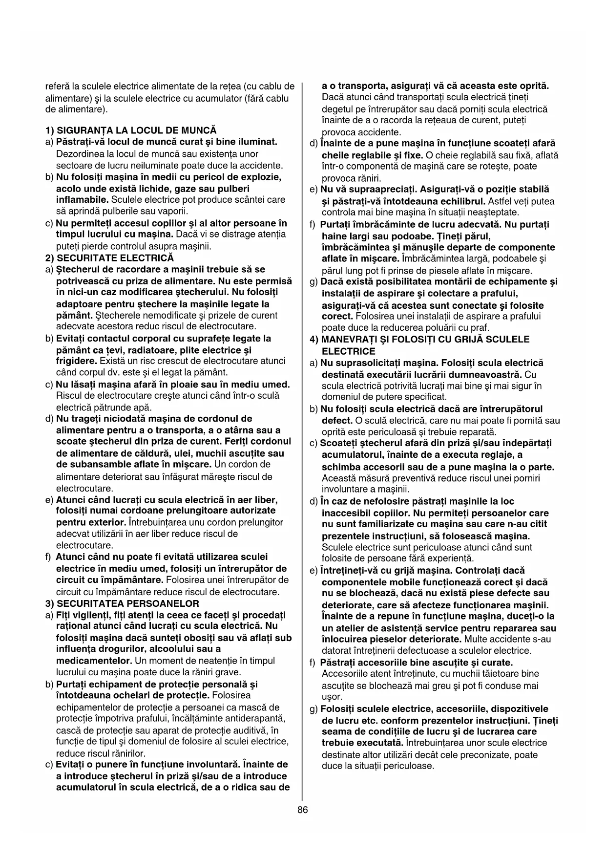 g) Folosi sculele electric, accesoriile, dispositivele de lucru etc. conform prezentelor instrucliuri. Tineti seama de conditiile de lucru si de lucrarea care trebuie executata. Intrebuintarea unor scule electric destinate alter utilzari decat cele preconizate, poate duce la situati periculoase.