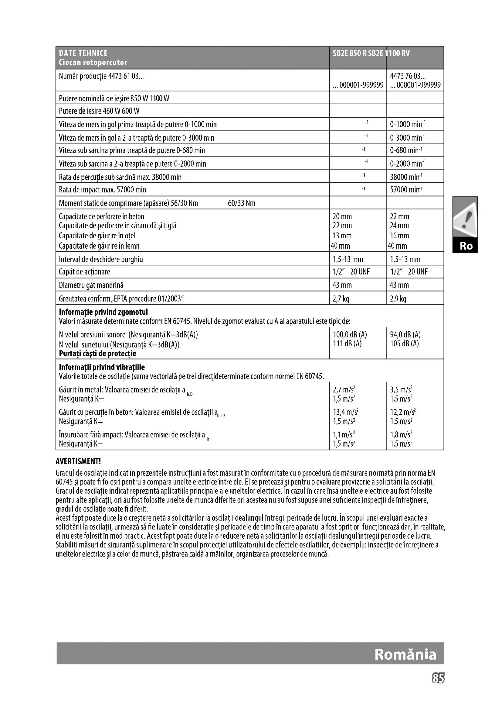 Utilizaţi numai accesorii şi piese de schimb AEG. Dacă unele din componente care nu au fost descrise trebuie înlocuite , vă rugăm contactaţi unul din agenţii de service AEG (vezi lista noastră pentru service / garanţie) Dacă este necesară, se poate comanda o imagine descompusă a sculei. Vă rugăm menţionaţi numărul art. Precum şi tipul maşinii tipărit pe etichetă şi comandaţi desenul la agenţii de service locali sau direct la Techtronic Industries GmbH, Max-Eyth-Straße10, 71364Winnenden, Germany. SIMBOLURI PERICOL! AVERTIZARE! ATENŢIE! Întotdeauna scoateţi stecarul din priza înainte de a efectua intervenţii la maşină. Va rugăm citiţi cu atenţie instrucţiunile înainte de pornirea maşinii Accesoriu - Nu este inclus în echipamentul standard , disponibil ca accesoriu Aruncarea aparatelor electrice la gunoiul menajer este interzisă. Echipamentele electrice şi electronice trebuie colectate separat şi predate la un centru de reciclare şi eliminare a deşeurilor, pentru a eliminate ecologic. Interesaţi-vă la autorităţile locale sau la comerciantul dvs. de specialitate unde se aă centre de reciclare şi puncte de colectare. Sculă electrică cu clasa de protecţie II. Sculă electrică la care protecţia împotriva unei electrocutări nu depinde doar de izolaţia de bază, ci şi de aplicarea de măsuri suplimentare de protecţie, cum ar o izolaţie dublă sau o izolaţie mai puternică. Marcaj CE Marcaj de conformitate UkrSEPRO . Marcaj de conformitate EurAsian. Romănia88 English Mak ТЕХНИЧКИ ПОДАТОЦИ Ударна бормашин а SB2E 850 R SB2E 1100 RV Производен број 4473 61 03... ... 000001-999999