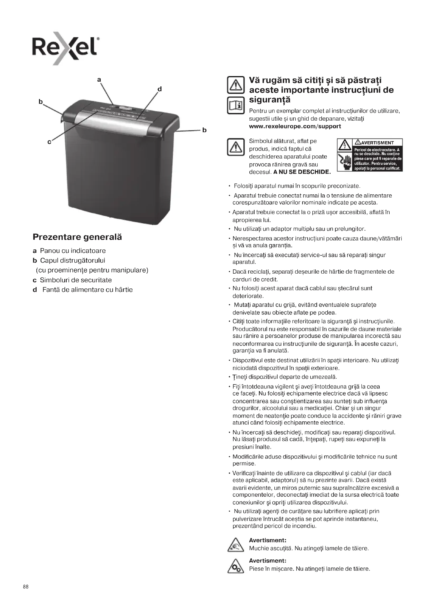 Vă rugăm să citiți și să păstrați aceste importante instrucțiuni de siguranță Pentru un exemplar complet al instrucțiunilor de utilizare, sugestii utile și un ghid de depanare, vizitați www.rexeleurope.com/support Avertisment: Muchie ascuțită. Nu atingeți lamele de tăiere. Avertisment: Piese în mișcare. Nu atingeți lamele de tăiere. Prezentare generală a Panou cu indicatoare b Capul distrugătorului (cu proeminențe pentru manipulare) c Simboluri de securitate d Fantă de alimentare cu hârtie