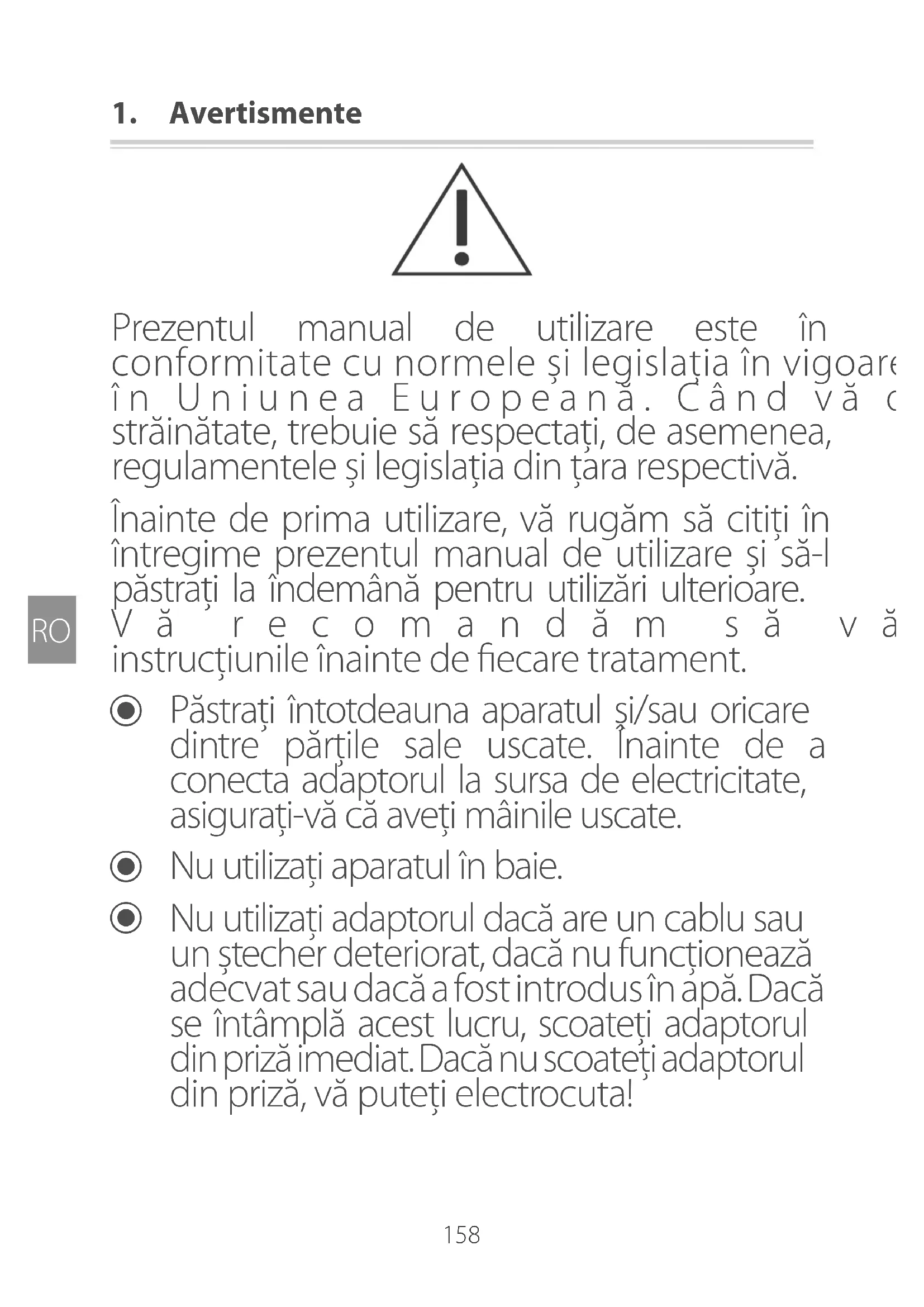 Păstrați întotdeauna aparatul și/sau oricare dintre părțile sale uscate. Înainte de a conecta adaptorul la sursa de electricitate, asigurați-vă că aveți mâinile uscate.