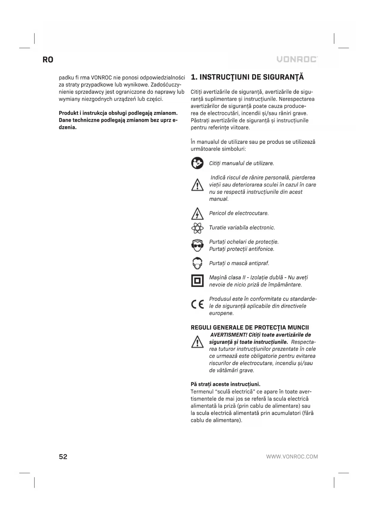 - Folosirea unor piese de schimbe neoriginale. Aceasta acoperă garanția companiei, explicită sau implicită. Nu există alte garanții explicite sau impli- cite care să se extindă dincolo de cele indicate aici, incluzând garanțiile, vandabilitatea sau adecvarea pentru un anumit scop. În nicio situație, VONROC nu este responsabil pentru daunele incidentale sau consecvențiale. Reparațiile efectuate de repre- zentant trebuie să fi e limitate la reparațiile sau la înlocuirea unităților sau a pieselor neconforme. Produsul și manualul de utilizare pot suferi modi- fi cări. Specifi cațiile se pot modifi ca fără notifi care prealabilă.58