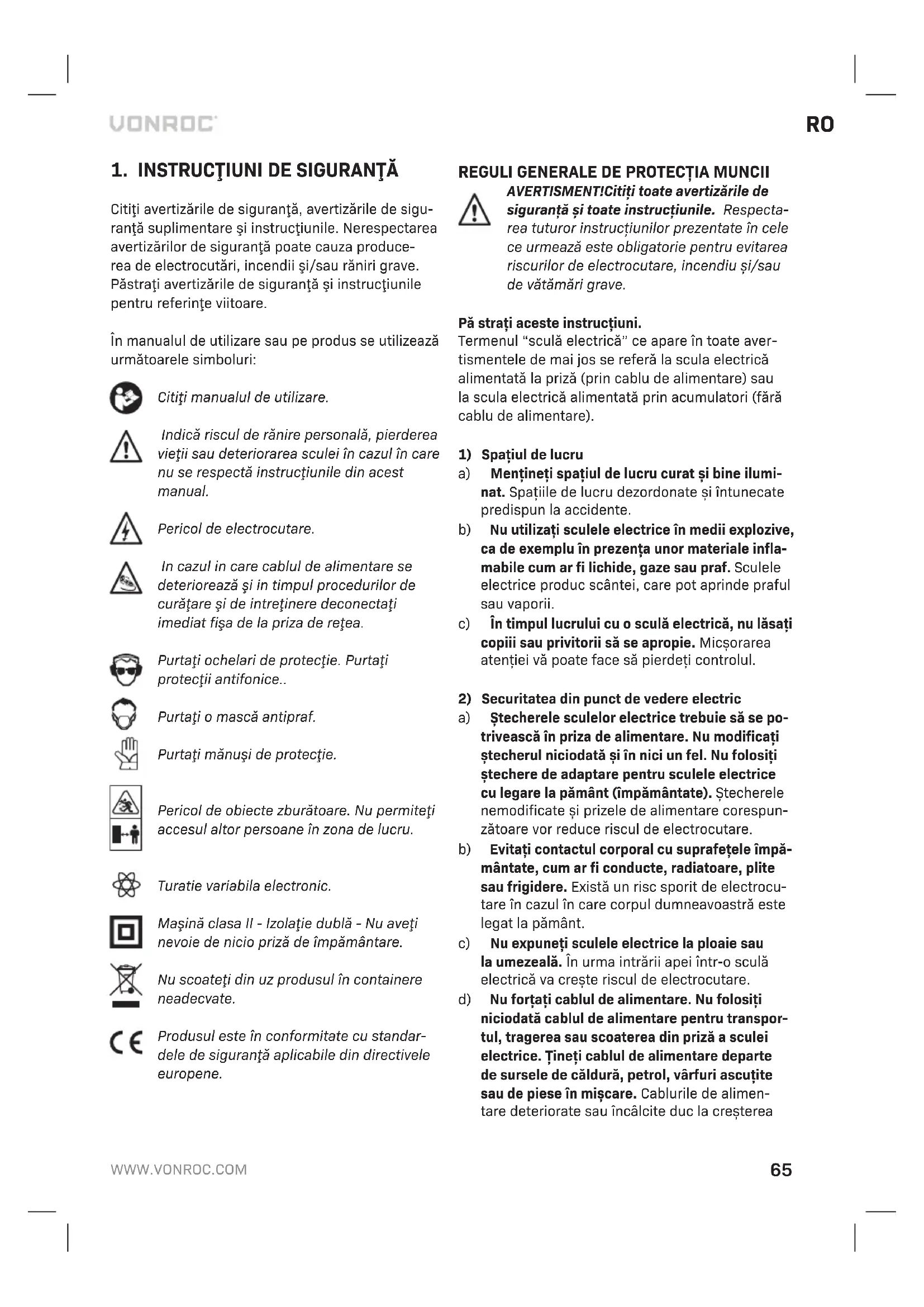 Numai pentru ţările din CE Nu aruncaţi echipamentele acţionate electric îm- preună cu gunoiul menajer. Conform Indicaţiei eu- ropene 2012/19/EU pentru echipamente electrice şi electronice uzate şi a implementării sale la nivel naţional, echipamentele acţionate electric scoase din uz trebuie colectate separat şi evacuate într-o manieră ecologică. GARANŢIE Produsele VONROC sunt realizate la cele mai înalte standarde de calitate şi sunt garantate în pri- vinţa materialelor şi a manoperei pentru întreaga perioadă de utilizare în garanţie, începând cu data achiziţiei. În cazul în care produsul se defectează în timpul perioadei de utilizare, contactaţi direct VONROC. Următoarele circumstanţe sunt excluse de la această garanţie: