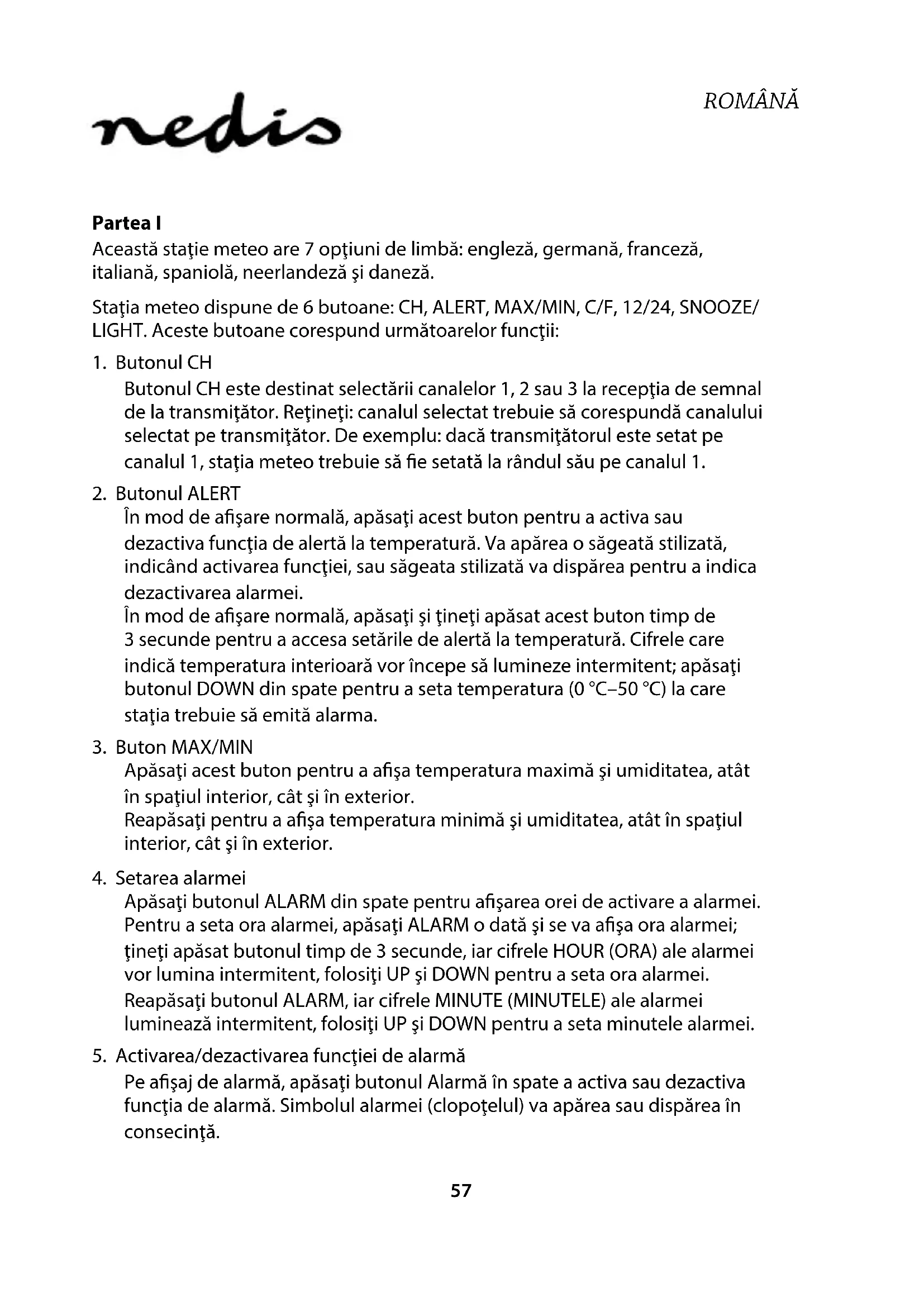 Partea I Această staţie meteo are 7 opţiuni de limbă: engleză, germană, franceză, italiană, spaniolă, neerlandeză şi daneză. Staţia meteo dispune de 6 butoane: CH, ALERT, MAX/MIN, C/F, 12/24, SNOOZE/ LIGHT. Aceste butoane corespund următoarelor funcţii: