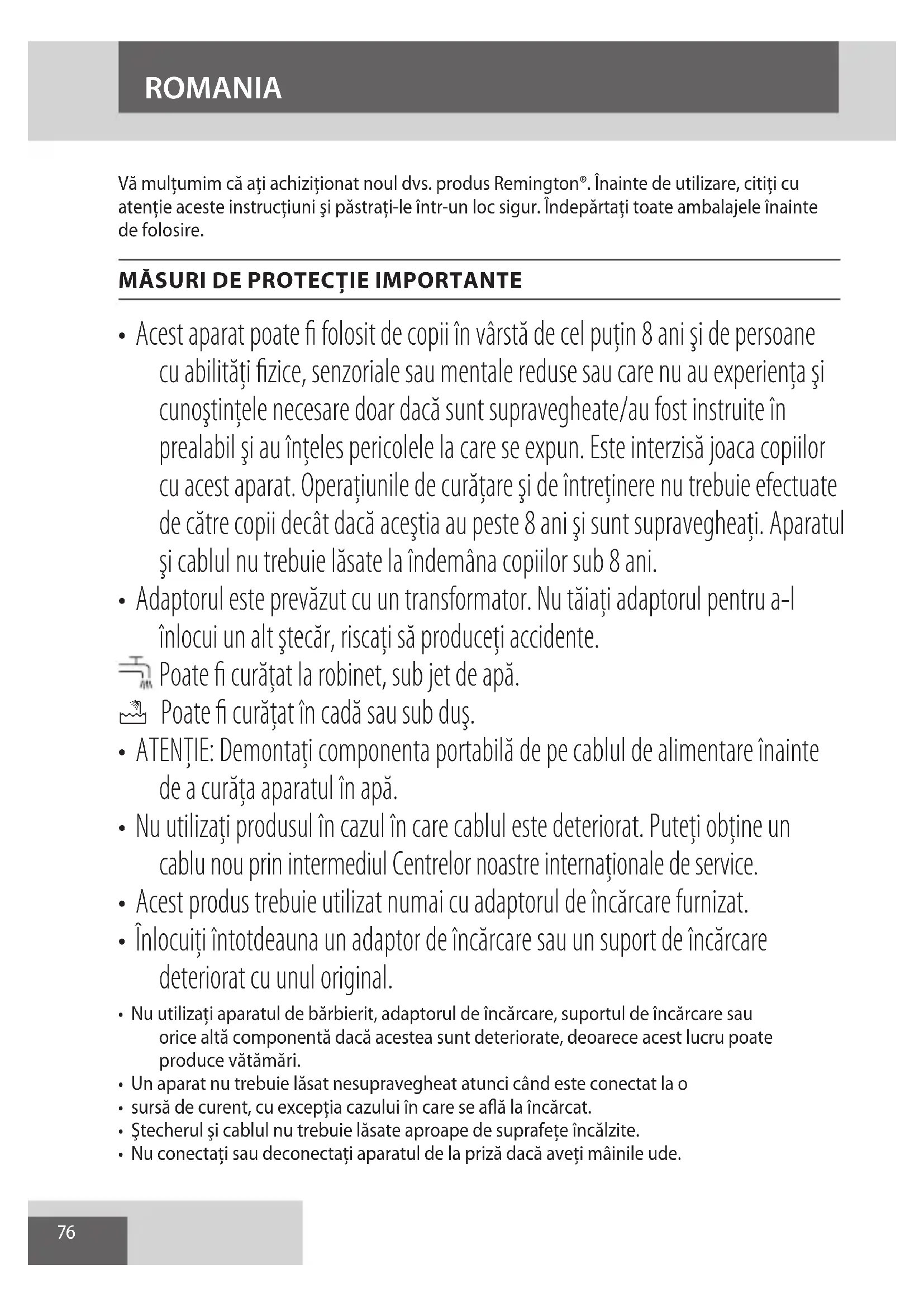 - Adaptorul este prevăzut cu un transformator. Nu tăiaţi adaptorul pentru a-l înlocui un alt ştecăr, riscaţi să produceţi accidente. Poate fi curăţat la robinet, sub jet de apă. E Poate fi curăţat în cadă sau sub duş.
