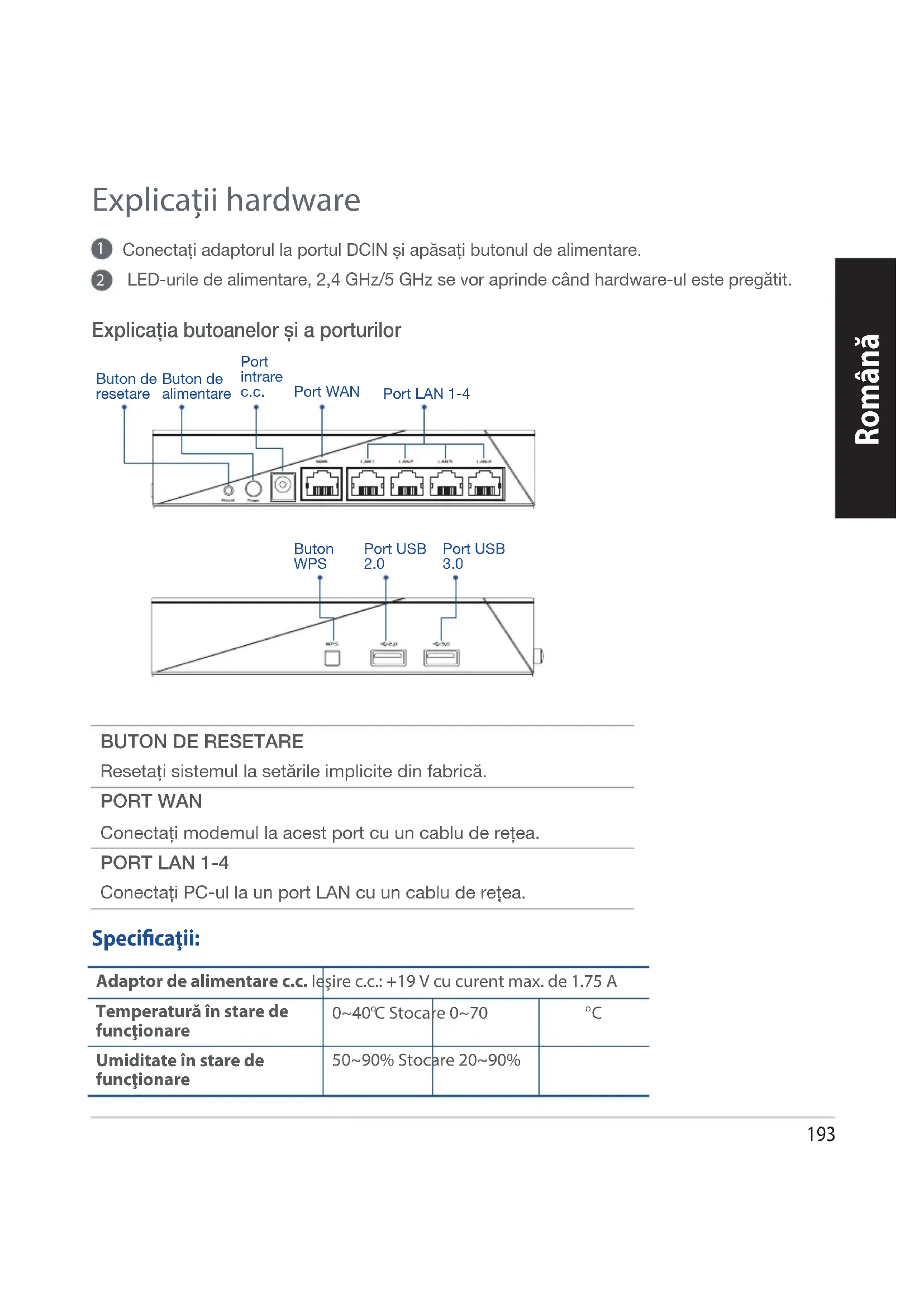 Resetați sistemul la setările implicite din fabrică. PORT WAN Conectați modemul la acest port cu un cablu de rețea.