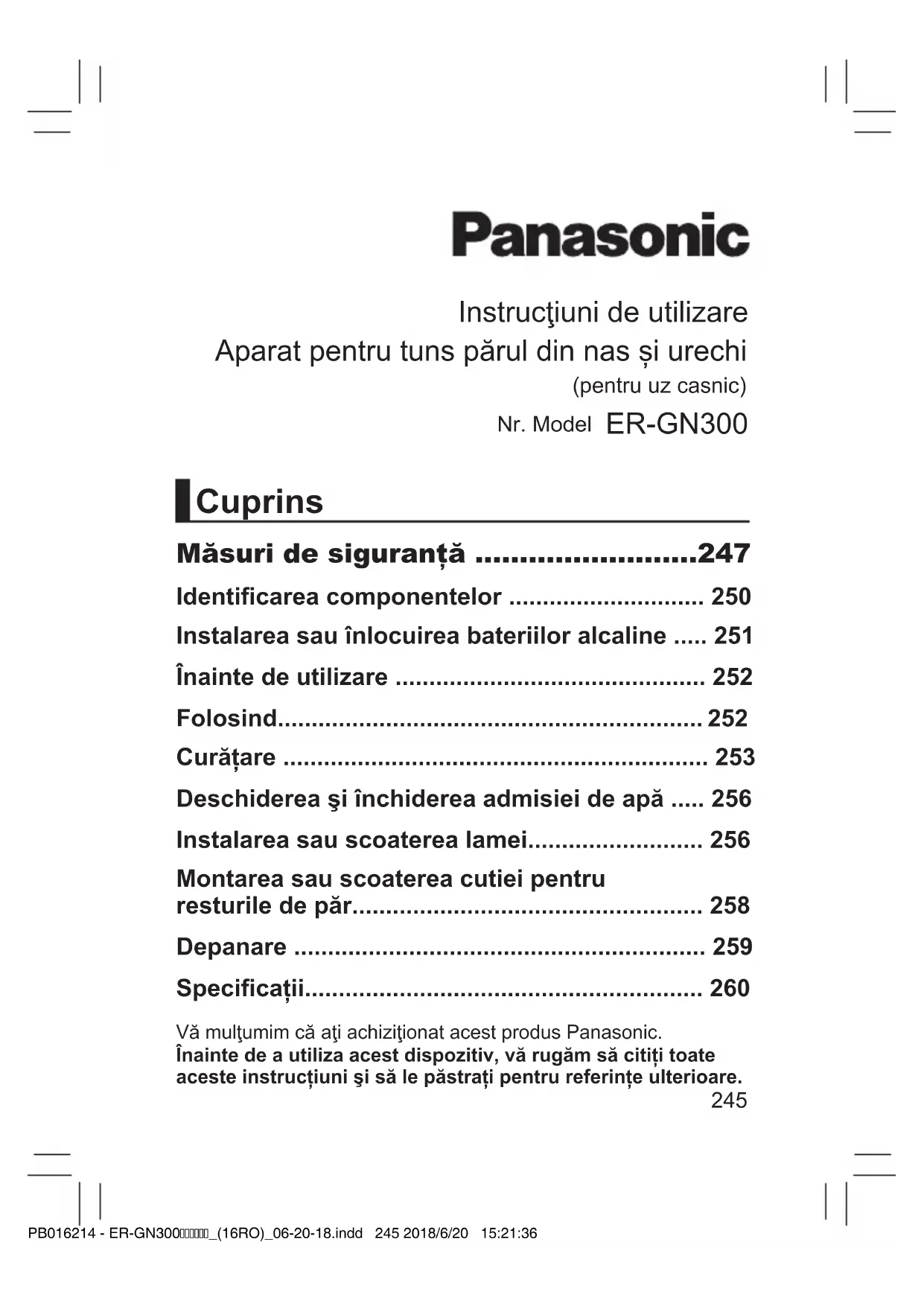 - Rotiți inelul comutator pentru spălare până când semnul „ ” se aliniază cu semnul „ ” de pe piesa principală. PB016214 - ER-GN300_(16RO)_06-20-18.indd 258 2018/6/20 15:21:39259 Depanare Problemă Acţiune Rezultatul tăierii s-a depreciat. Înlocuiți lama. (Vezi paginile 256-257) Înlocuiți bateriile alcaline. (Vezi pagina 251) Curățați lama internă. (Vezi paginile 253-255) Emană un miros ciudat. Lama nu se mișcă/ rotește lin. Puterea de succțiune este scăzută. Curățați cutia pentru resturile de păr. (Vezi paginile 253-255). Închideți admisia apei. (Vezi paginile 252 și 256). Aparatul nu este pornit. Puneți corect bateriile alcaline. (A se vedea pagina 251). Înlocuiți bateriile alcaline. (A se vedea pagina 251). Dacă problemele tot nu pot rezolvate, contactați magazinul în care ați cumpărat dispozitivul sau un centru service autorizat de Panasonic pentru reparații. PB016214 - ER-GN300_(16RO)_06-20-18.indd 259 2018/6/20 15:21:39260 Specicaţii Alimentare Baterie seacă Tipul bateriei Două LR03 (Baterii alcaline AAA) (Vândute separat) Zgomot aerian 58 (dB (A) re 1 pW) Aceste produs este destinat numai utilizării casnice. Depunerea la deşeuri a echipamentelor Doar pentru Uniunea Europeană şi pentru ţările cu sisteme de reciclare Acest simbol de pe produse, ambalaje şi/sau documentele însoţitoare indică faptul că produsele electrice şi electronice nu trebuie să e amestecate cu deşeurile menajere obişnuite. Pentru un tratament corespunzător, pentru recuperarea şi reciclarea produselor vechi, vă rugăm să le depuneţi la punctele de colectare special amenajate, în conformitate cu legislaţia naţională. Prin depunerea corespunzătoare a acestora la deşeuri, veţi ajuta la economisirea unor resurse valoroase şi veţi preveni potenţiale efecte negative asupra sănătăţii umane şi asupra mediului înconjurător. Pentru mai multe informaţii despre colectare şi reciclare, vă rugăm să contactaţi autorităţile locale. Este posibil ca depunerea incorectă la deşeuri să e pedepsită în conformitate cu legile naţionale. PB016214 - ER-GN300_(16RO)_06-20-18.indd 260 2018/6/20 15:21:39261 Bu Panasonic ürününü aldığınız için teşekkür ederiz.Bu üniteyi kullanmadan önce lütfen talimatları eksiksiz okuyun ve ileride kullanmak için saklayın. Kullanım Talimatları (Ev İçin) Burun ve Yüz Kılı Kesicisi Model No. ER-GN300 İçindekiler Güvenlik önlemleri ...........................263 Parçaların tanımı................................................. 266 Alkalin pilleri takma veya değiştirme................ 267 Kullanım öncesinde............................................ 267 Kullanma ............................................................. 268 Temizleme ........................................................... 269 Su girişini açma ve kapatma ............................. 271 Bıçağı takma veya çıkarma ................................ 271 Kırpıntı kutusunu takma veya çıkarma ............. 273 Sorun Giderme.................................................... 274 Teknik Özellikler ................................................. 274 PB016214 - ER-GN300_(17TR)_06-21-18.indd 261 2018/6/21 11:18:52262 Uyarı