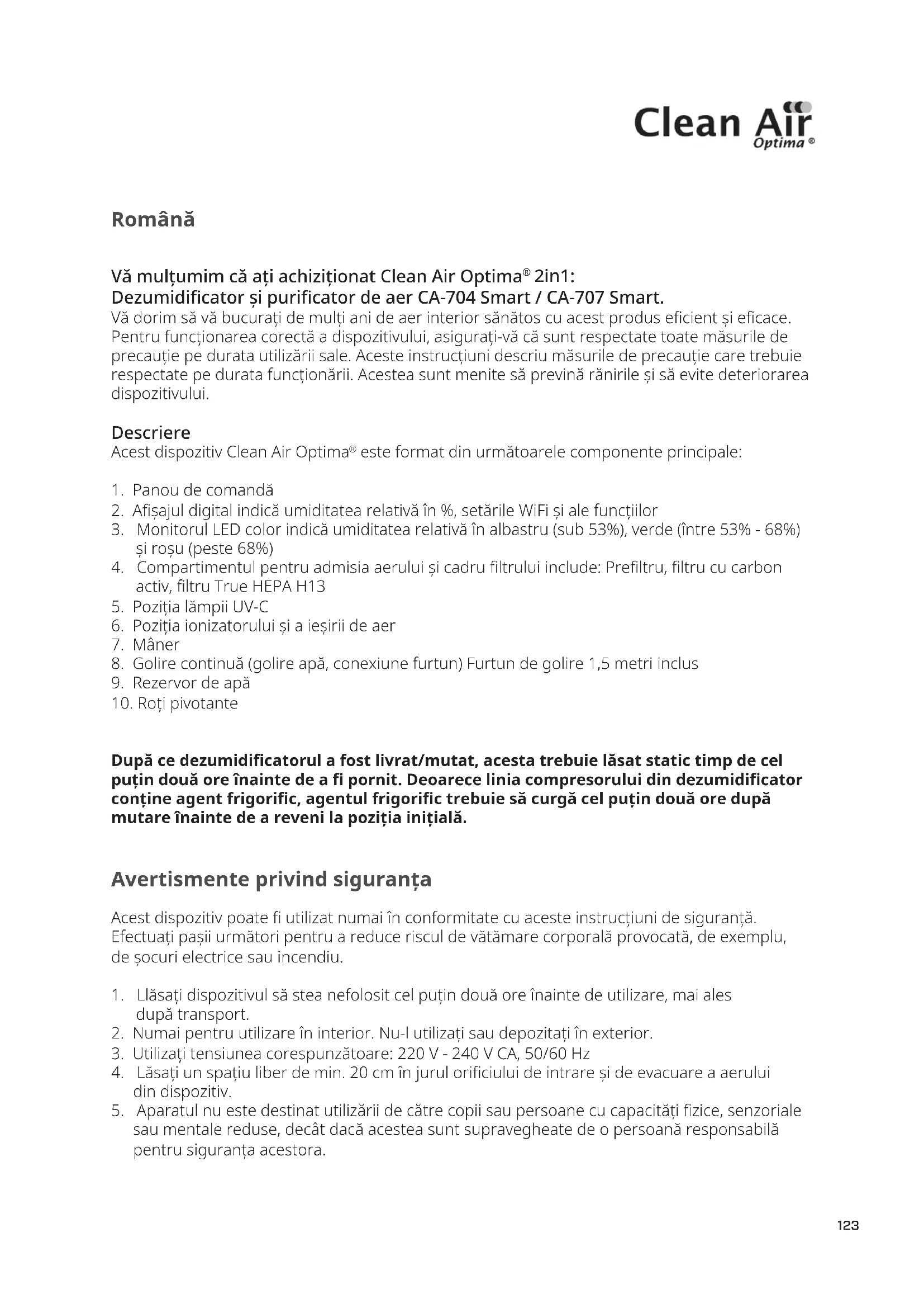 Pentru intrebări freventa despre CA-704 Smart / CA-707 Smart mergeti la: www.cleanairoptima.com Şi căți CA-704 Smart / CA-707 Smart.