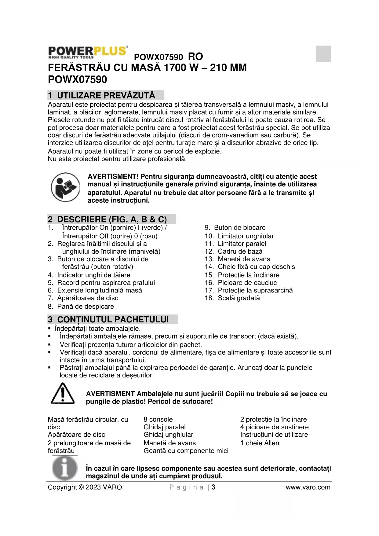 - Utilizați un ghidaj suplimentar aflat în contact cu suprafața mesei atunci când despicați piese de prelucrat mai subțiri de 2 mm.POWX07590 RO Copyright © 2023 VARO P a g i n a | 7 www.varo.com