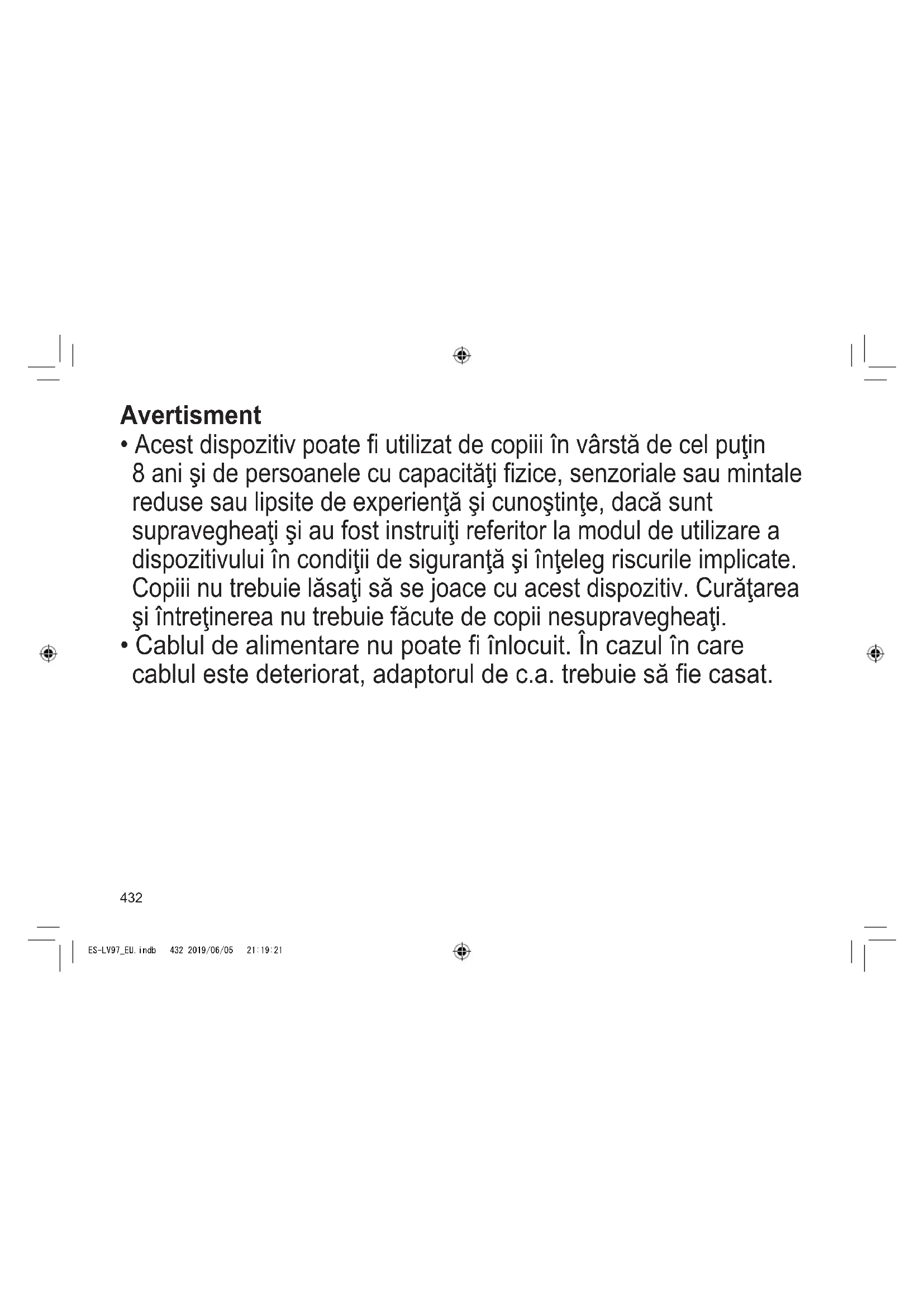- Acest dispozitiv poate utilizat de copiii în vârstă de cel puţin 8 ani şi de persoanele cu capacităţi zice, senzoriale sau mintale reduse sau lipsite de experienţă şi cunoştinţe, dacă sunt supravegheaţi şi au fost instruiţi referitor la modul de utilizare a dispozitivului în condiţii de siguranţă şi înţeleg riscurile implicate. Copiii nu trebuie lăsaţi să se joace cu acest dispozitiv. Curăţarea şi întreţinerea nu trebuie făcute de copii nesupravegheaţi.