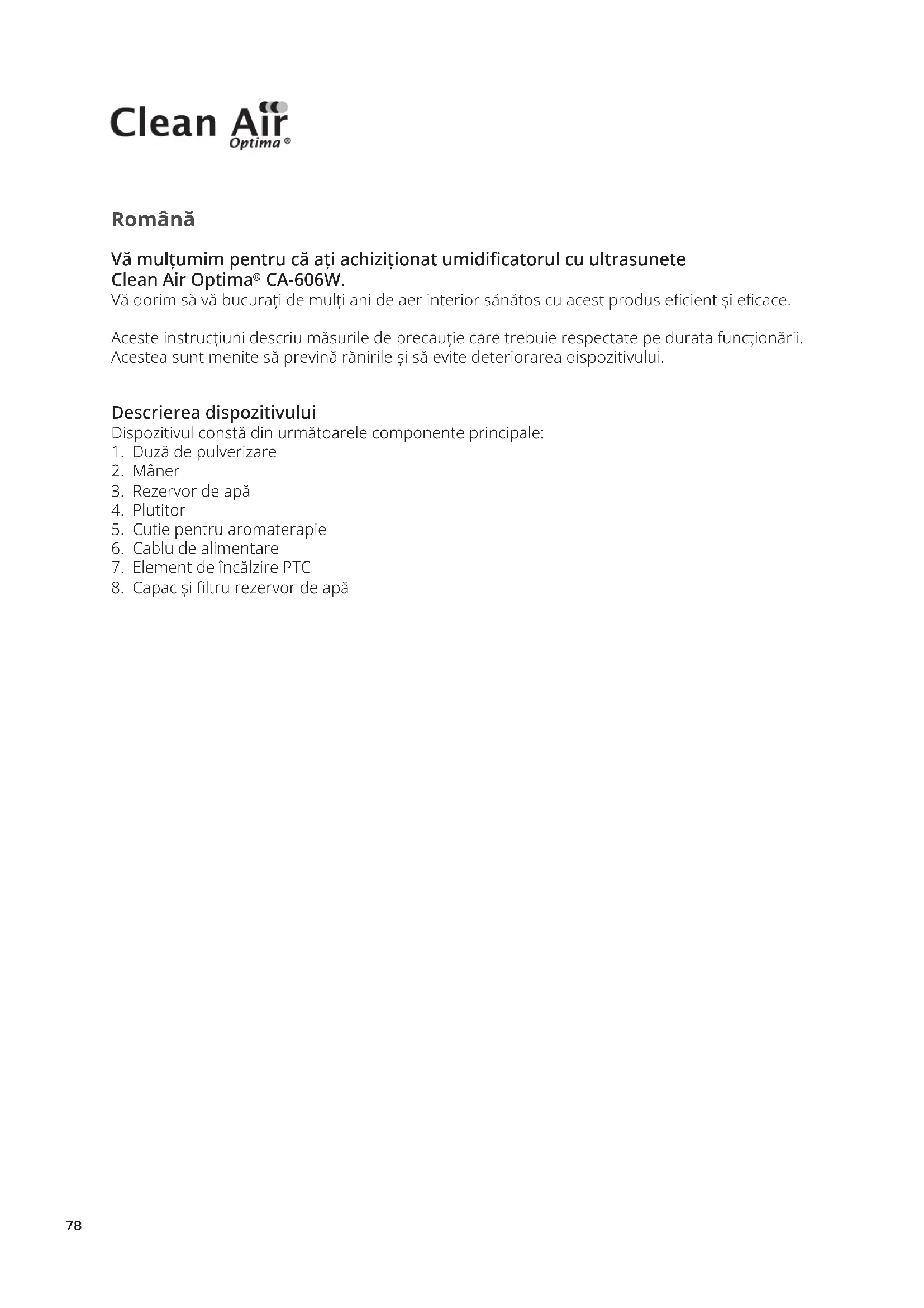 Vă multumim pentru că ați achiziționat umidificatorul cu ultrasunete Clean Air Optima® CA-606W.