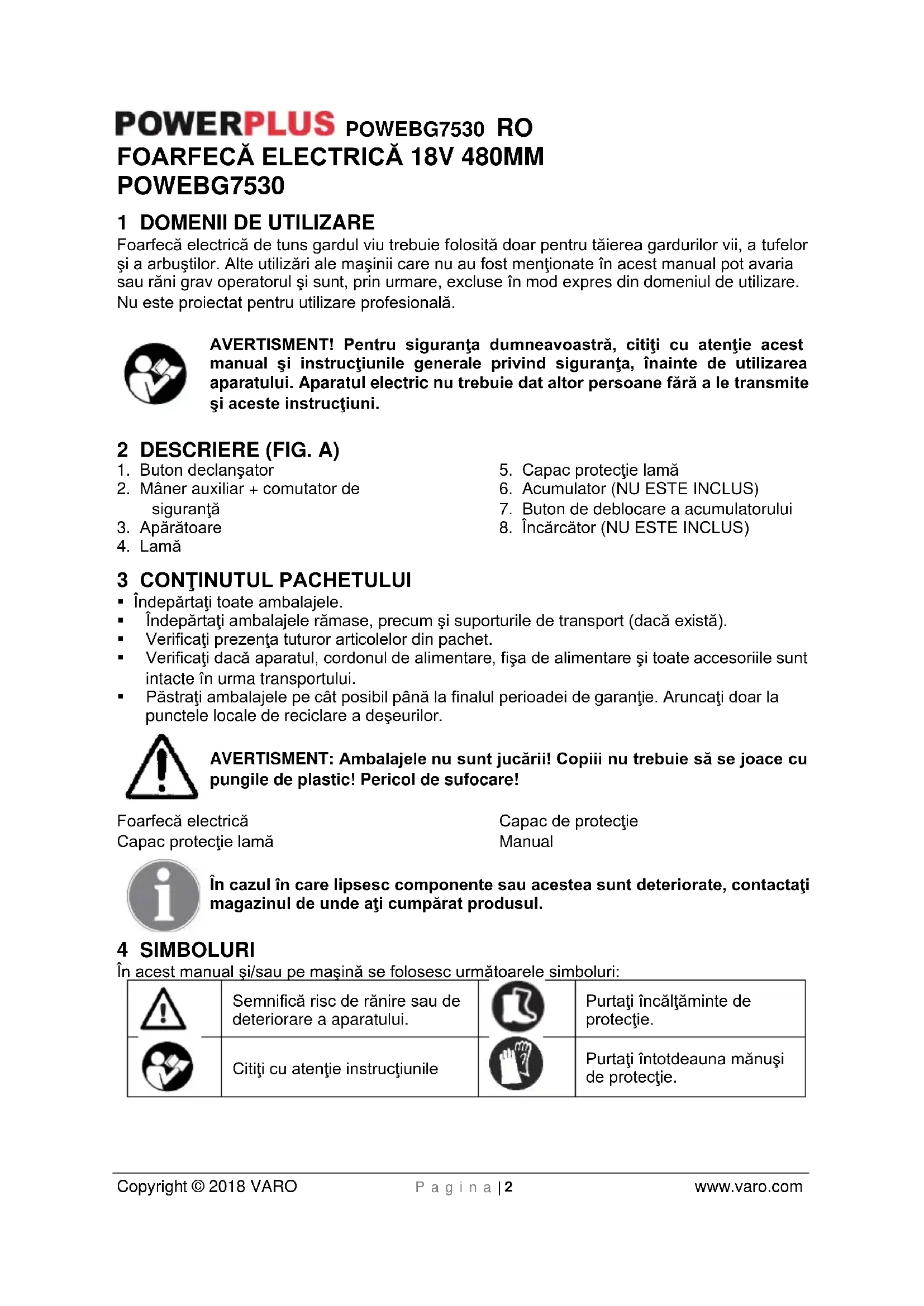 VARO N.V. - Joseph Van Instraat 9 - BE2500 Lier - BELGIA, declară că Produsul: Foarfecă electrică Marcă de comerţ: POWERplus Model: POWEBG7530 este în conformitate cu specificaţiile esenţiale şi alte prevederi relevante ale Directivelor Europene aplicabile, pe baza aplicării standardelor europene armonizate. Orice modificare neautorizată a aparatelor atrage după sine anularea acestei declaraţii. Directivele europene (inclusiv, dacă este cazul, amendamentele lor, până la data semnăturii); 2011/65/EU 2014/30/EG 2006/42/EG 2000/14/EG Annex V LwA 89dB(A) / 92dB(A) Standardele europene armonizate (inclusiv, dacă este cazul, amendamentele lor, până la data semnăturii); EN60745-1: 2009 EN60745-2-15: 2009 EN55014-1: 2006 EN55014-2: 2015 Persoana care păstrează documentaţia tehnică: Philippe Vankerkhove, VARO – Vic. Van Rompuy N.V. Subsemnatul acţionează în numele Directorului general executiv al societăţii, Eric de Boer Divizia de reglementare – Director de conformitate Data: 24/10/2017POWEBG7530 PL Copyright © 2018 VARO P a g e | 1 www.varo.com 1 ZASTOSOWANIE............................................................................. 2